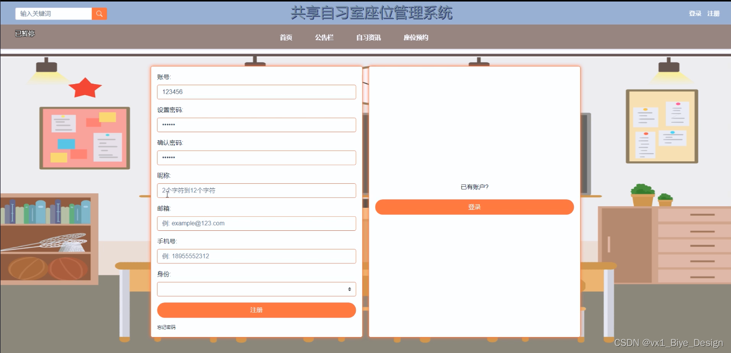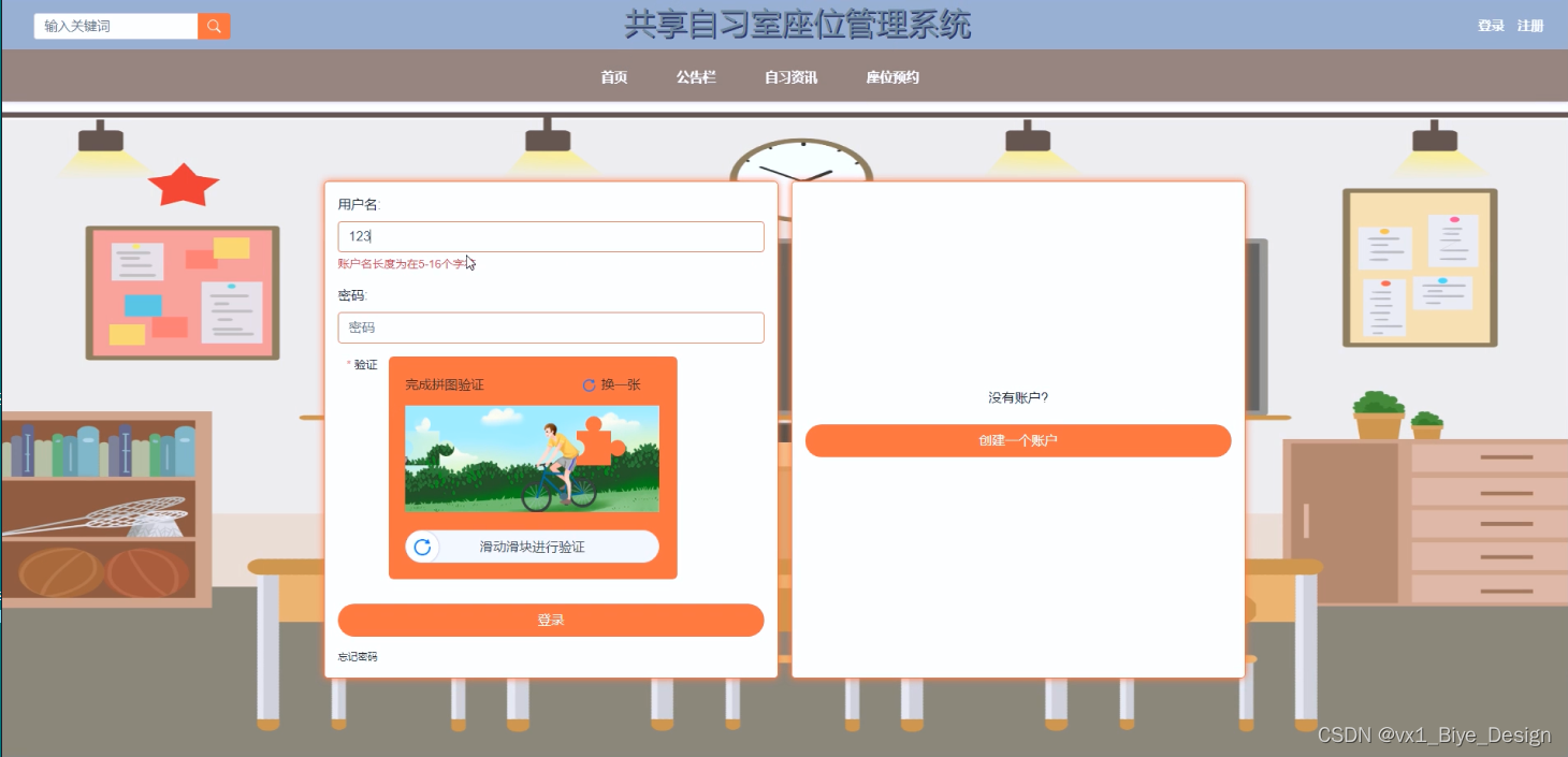 (1)用户注册登录:游客可以随时进入到系统中,对系统中的信息浏览,但是想要实现座位预约等操作,就必须有这个系统的账号,如果没有账号的话,可以注册以后进行相关的操作,同时用户还可以通过“我的账户”这以按钮对个人信息以及操作的信息进行管控。