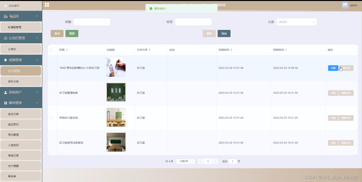 (3)资源管理:当点击“资源管理”这一菜单的时候,会出现自习资讯+资讯分类这两个子菜单,可以对这两个模块进行增删改查操作;
