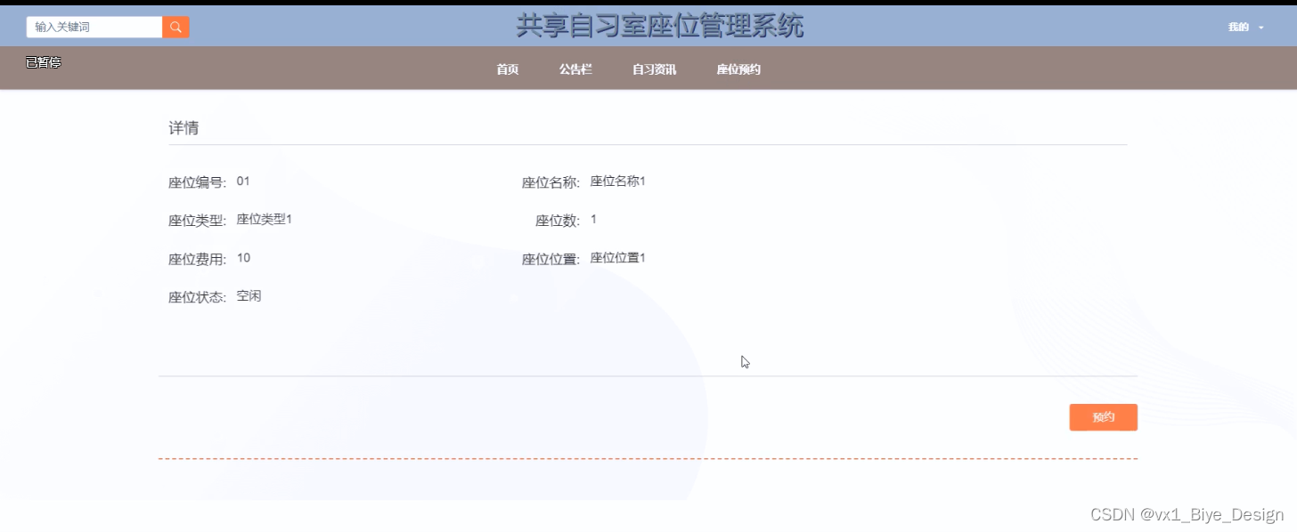 (6)座位预约:用户可以查看座位预约信息支持通过搜索关键词的方式对座位预约进行查询,在查询到自己想要了解的座位预约的时候,可以进入查看详细的介绍。
