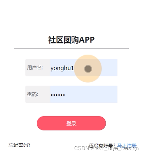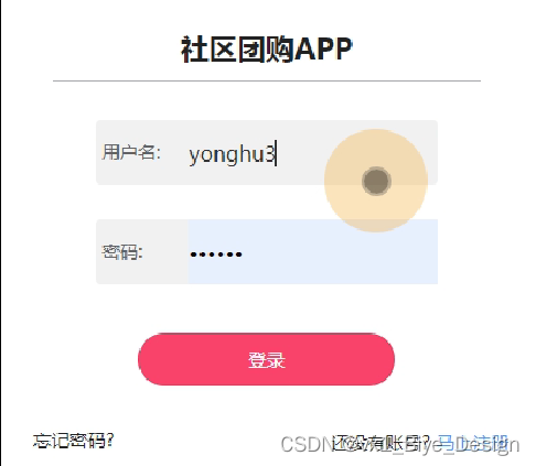 社区团购管理系统中的团员买家注册后的用户是可以通过自己的账户名和密码进行登录的,当用户输入完整的自己的账户名和密码信息并点击“登录”按钮后,将会首先验证输入的有没有空数据,再次验证输入的账户名+密码和数据库中当前保存的用户信息是否一致,只有在一致后将会登录成功并自动跳转到社区团购管理系统的首页中;否则将会提示相应错误信息,用户登录界面如下图4-12所示。