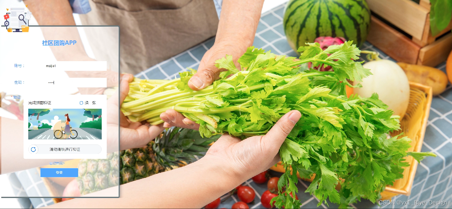 卖家通过自己的账户名和密码进行登录的,当卖家输入完整的自己的账户名和密码信息并点击“登录”按钮后,将会首先验证输入的有没有空数据,再次验证输入的账户名+密码和数据库中当前保存的用户信息是否一致,只有在一致后将会登录成功并自动跳转到社区团购管理系统的首页中;否则将会提示相应错误信息,卖家登录界面如下图4-16所示。