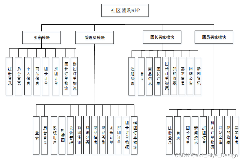 按照社区团购APP的角色,我划分为了买家、卖家管理模块和管理员管理模块这三大部分。