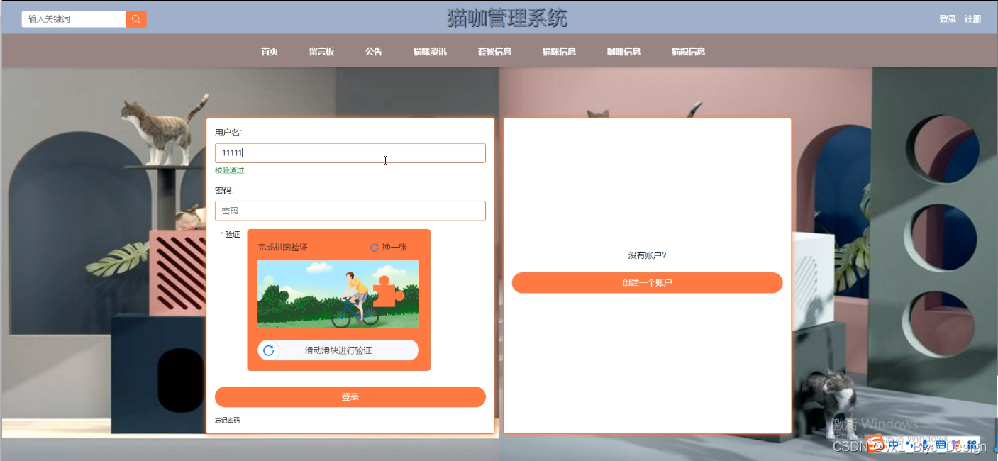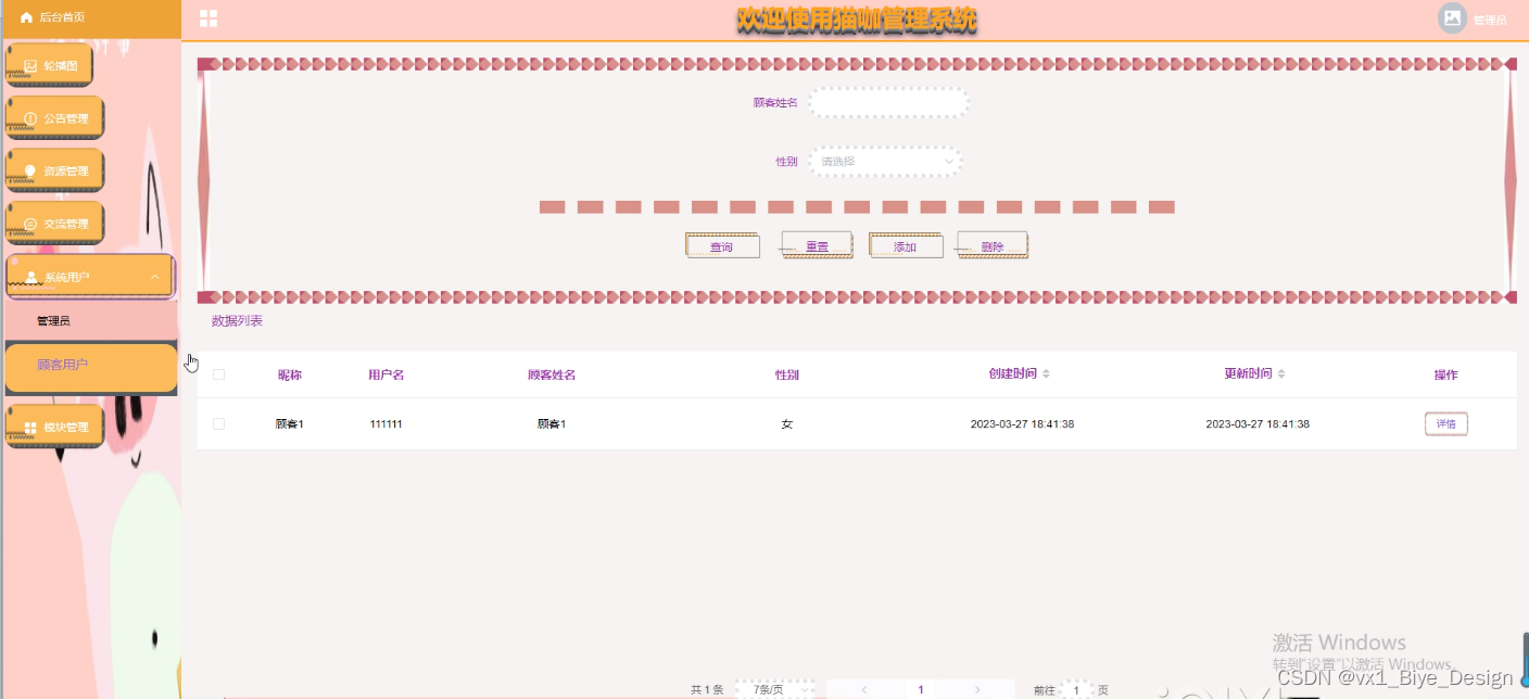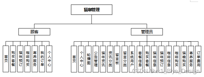 (1)功能要求:可以管理后台首页、轮播图(轮播图管理)、公告管理(公告)、资源管理(猫咪资讯、资讯分类)、交流管理(留言板、留言分类)、系统用户(管理员、顾客用户)、模块管理(套餐信息、购买套餐、猫咪信息、猫咪预订、咖啡信息、咖啡购买、猫粮信息、猫粮购买、寄养服务、订单费用)、个人中心等功能模块。