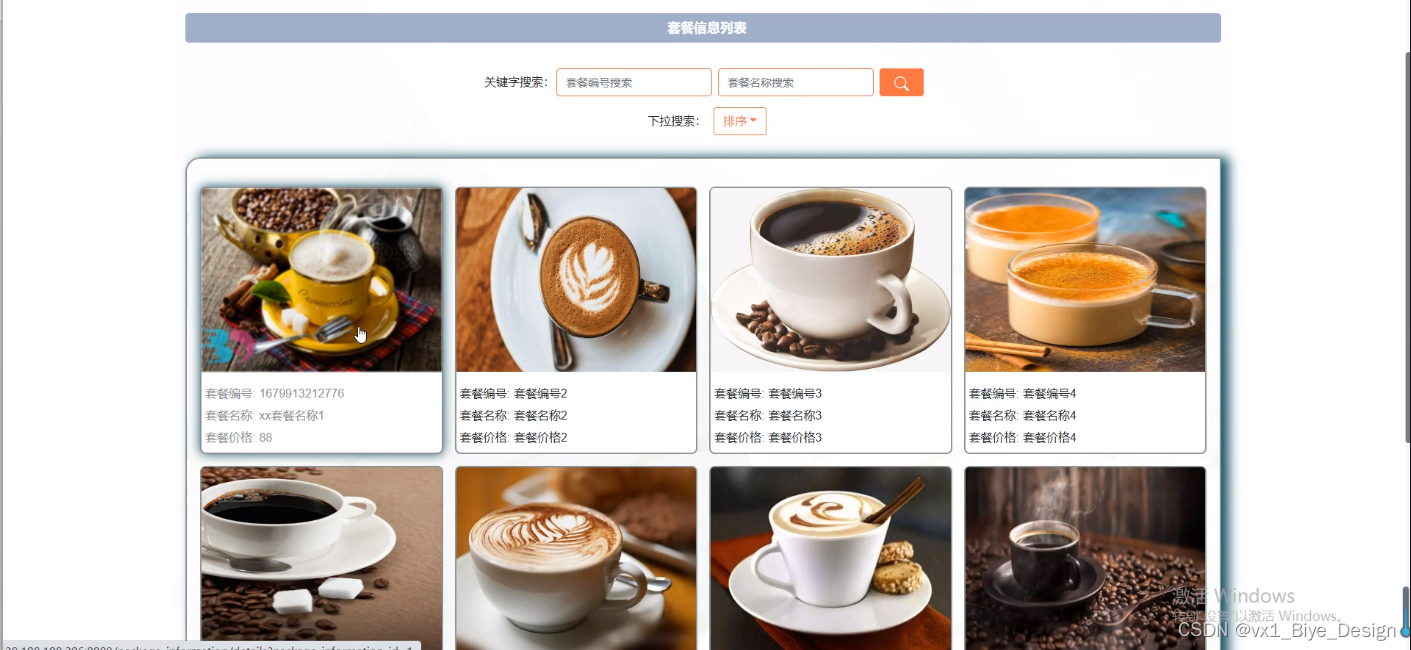 套餐信息列表,在套餐信息列表页面可以查看套餐编号、套餐名称、套餐价格、图片等详细内容进行购买套餐、评论、点赞、收藏等操作,如图5-2所示。