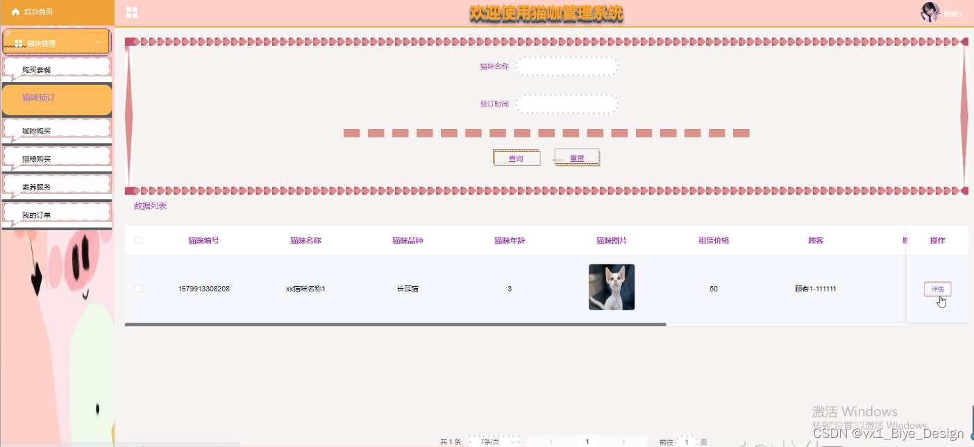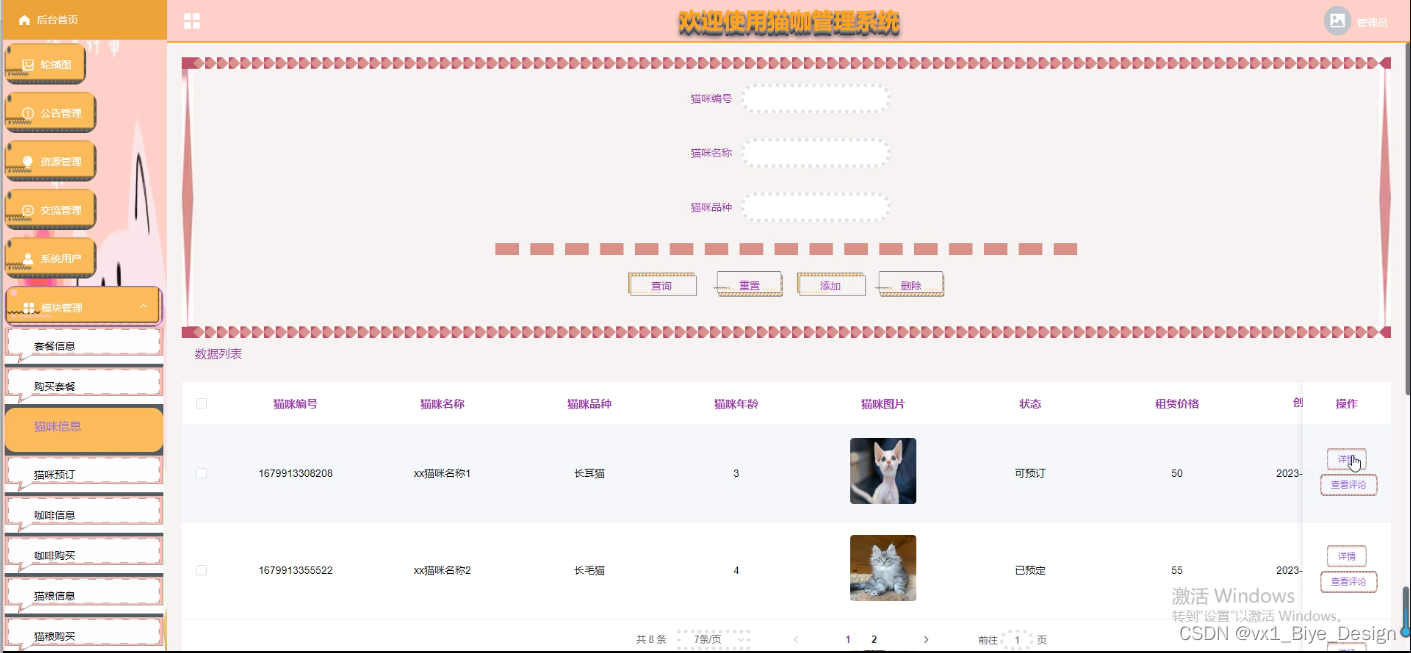 猫咪预订管理,在猫咪预订管理页面中可以对索引、猫咪编号、猫咪名称、猫咪品种、猫咪年龄、猫咪图片、租赁价格、顾客等信息进行详情、添加、或删除等操作,如图5-12所示。