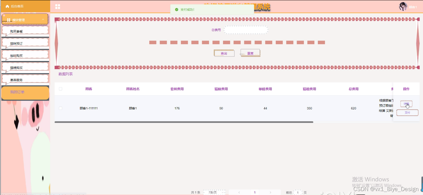 我的订单管理,在我的订单管理页面中可以对索引、顾客、顾客姓名、套餐费用、猫咪费用、咖啡费用、猫粮费用、总费用等信息进行详情支付、添加、或删除等操作,如图5-13所示。