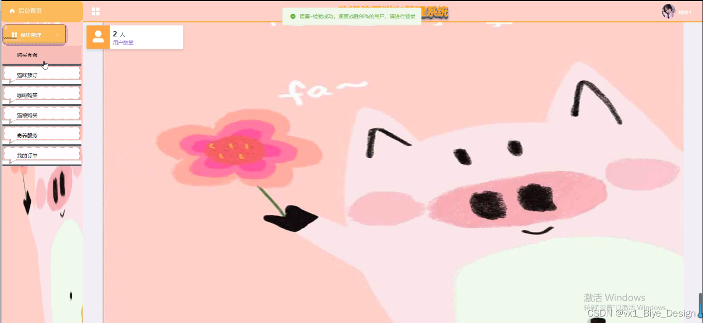 顾客登录进入平台后台可以查看系统首页、购买套餐、猫咪预订、咖啡购买、寄养服务、我的订单、个人中心等内容进行详细操作,如图5-11所示。