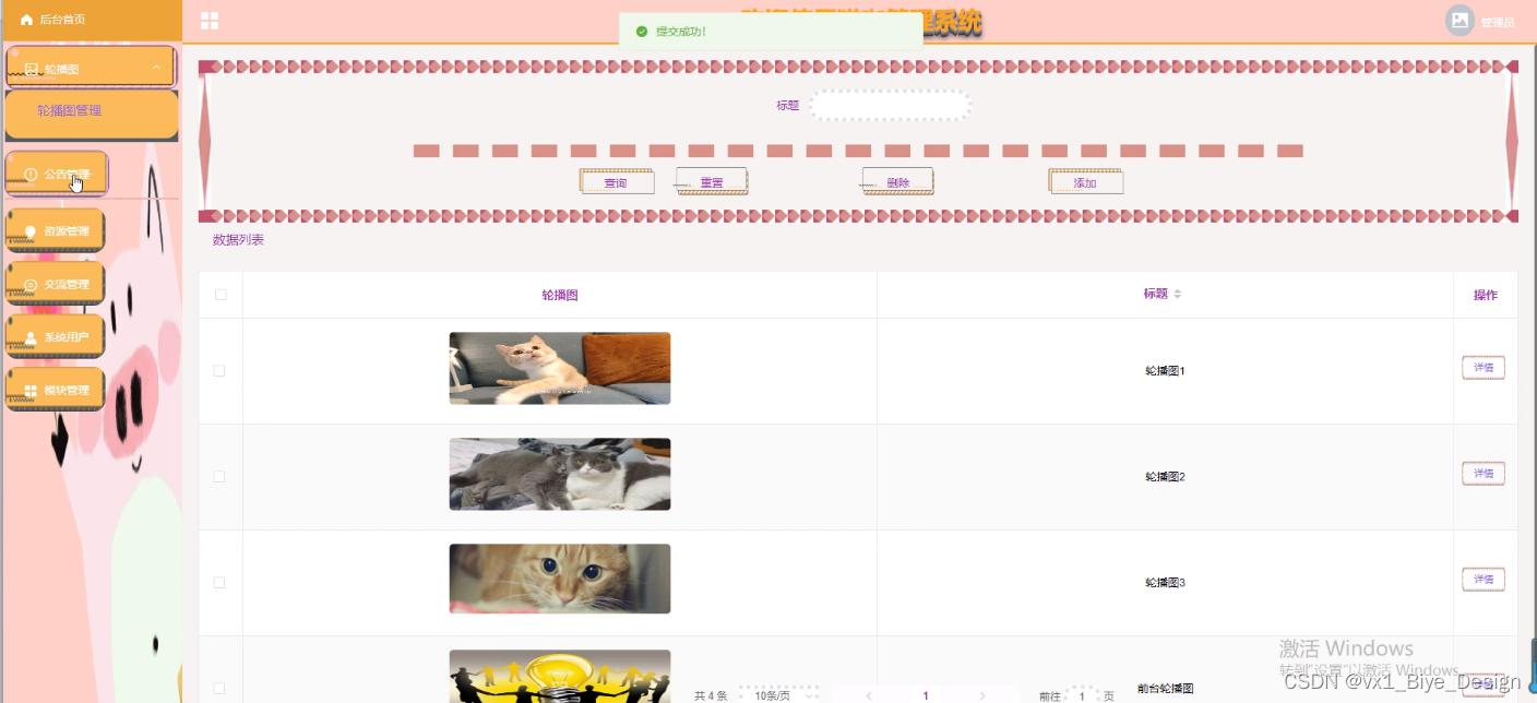 轮播图管理,在轮播图管理页面中可以对索引、名称、值等信息进行详情、添加、修改或删除等操作,如图5-9所示。