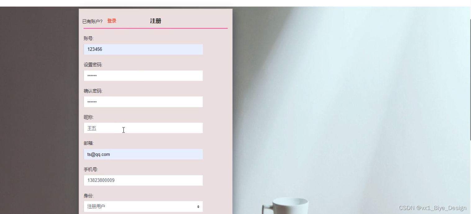 用户登录、用户注册,通过注册填写账号、设置密码、确认密码、昵称、邮箱、手机号、身份、用户编号、用户姓名、用户性别等信息进行注册、登录操作,如图5-14所示。