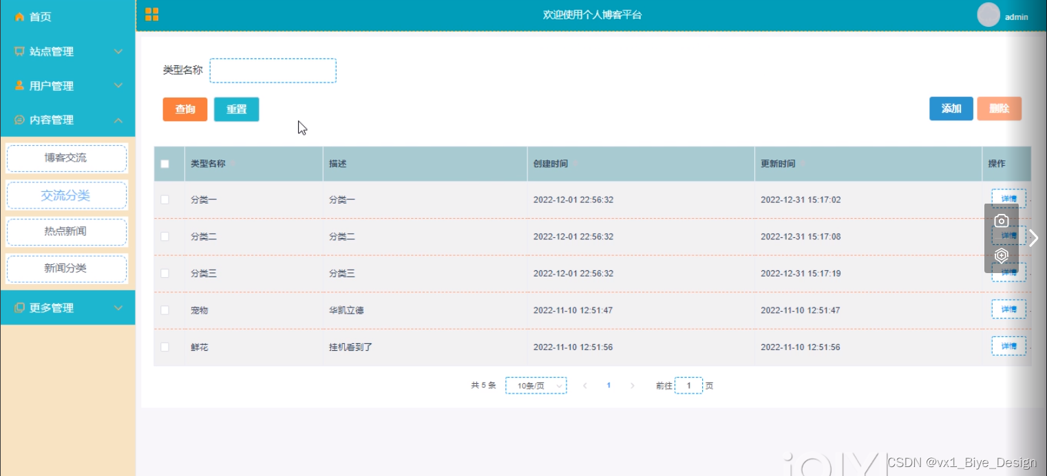 交流分类管理,在交流分类管理页面可以查看类型名称、描述等信息,并可根据需要对交流分类管理进行详情,删除或查看详细内容操作,如图5-5所示。