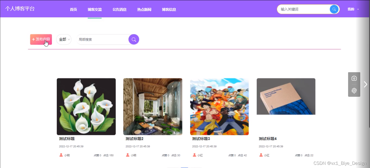 目前许多人仍将传统的纸质工具作为信息管理的主要工具,而网络技术的应用只是起到辅助作用。在对网络工具的认知程度上,较为传统的office软件等仍是人们使用的主要工具,而相对全面且专业的个人博客平台的设计与实现的信息管理软件仍没有得到大多数人的了解或认可。本选题则旨在通过标签分类管理等方式,管理员;首页、站点管理(轮播图、公告栏)、用户管理(管理员、注册用户)、内容管理(博客交流、交流分类、热点新闻、新闻分类)、更多管理(博客信息、博客类型、博客分享)。用户;首页、内容管理(博客交流)、更多管理(博客信息、博客类型、博客分享)、个人中心。前台首页;首页、博客交流、公告消息、热点新闻、博客信息、我的等信息管理功能,从而达到对个人博客平台的设计与实现的高效管理。