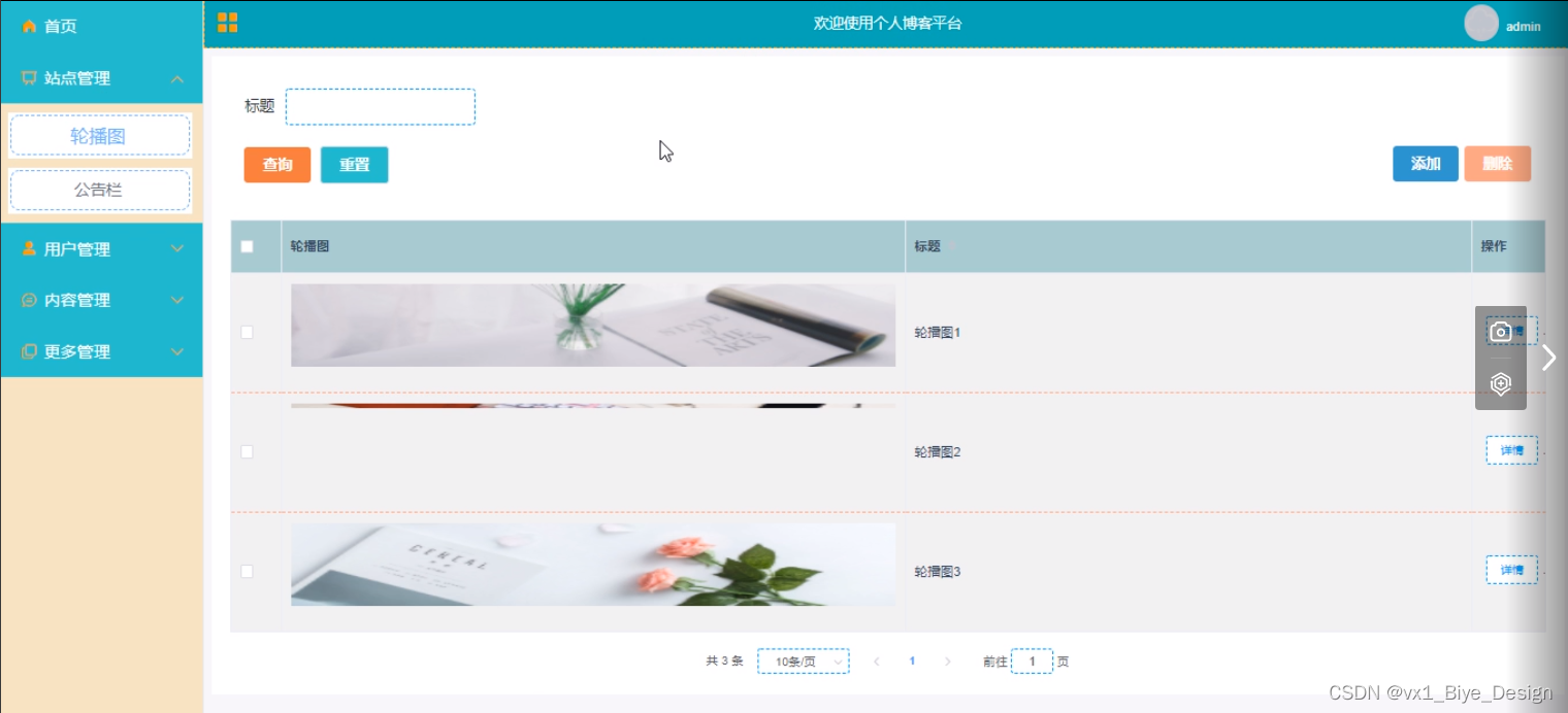 轮播图,在轮播图页面可以查看标题、轮播图等信息,并可根据需要对信息进行详情,修改,删除或查看详细内容等操作,如图5-3所示。