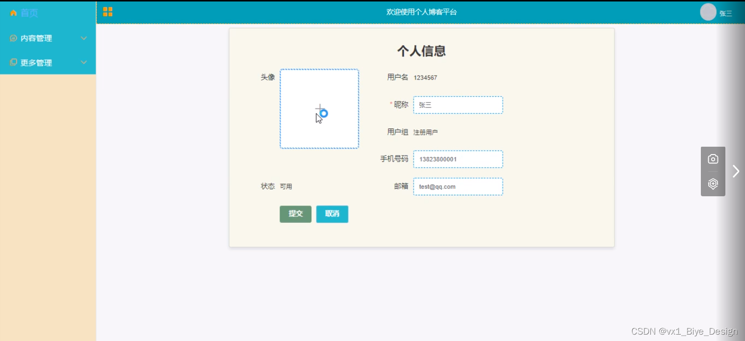 个人信息,在个人信息页面可以填写头像、用户名、昵称、用户组、手机号码、邮箱、状态等信息进行修改如图5-11所示。