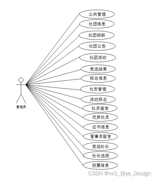 管理员所能使用的功能主要有:后台首页、公共管理(轮播图)用户管理(管理员、学生用户、社长用户)、个人资料(个人信息、修改密码)、社团信息、社团招新、报名信息、社员管理、社员留言、社团公告、社团活动、活动报名、优异社员、证书信息、管理员留言、竞选社长、社长选拔、投票信息、竞选结果等功能模块。