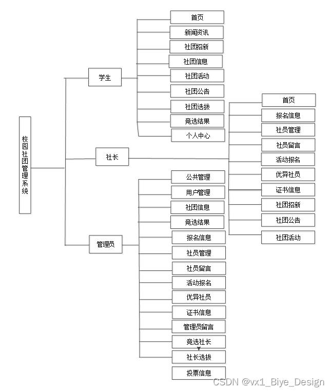 使用校园社团管理系统的分为管理员和学生用户、社长用户三个权限模块。