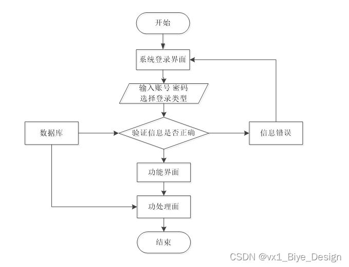 用户想进入系统,首先进入系统登录界面,通过正确的用户名、密码,选择登录类型登录,系统会检查登录信息,信息正确,然后输入相应的功能界面,提示信息错误,登录失败。系统操作流程如图3-4所示。