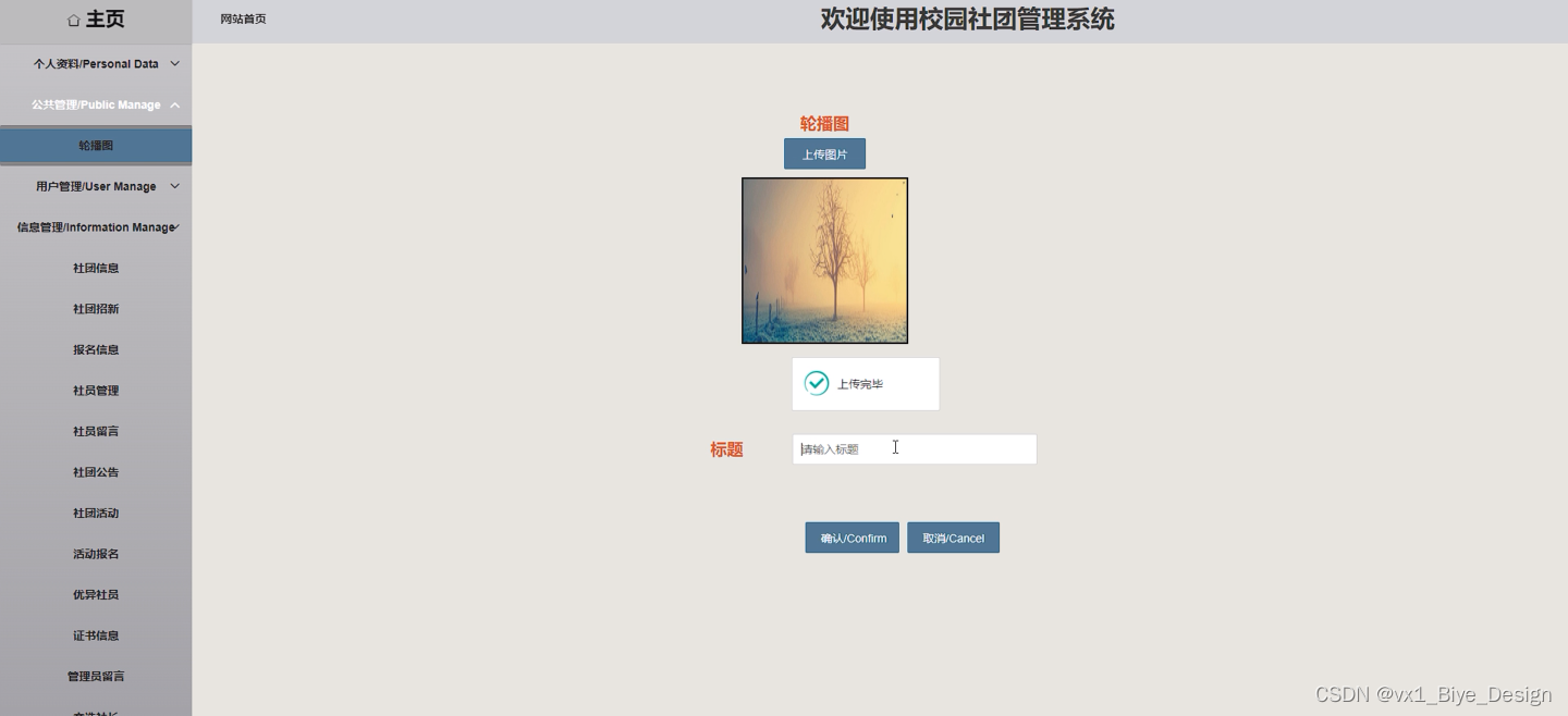 校园社团管理系统中的管理人员在“轮播图管理”这一菜单中是可以对前台显示的轮播图以及公告栏进行管控。界面如下图5-21所示。