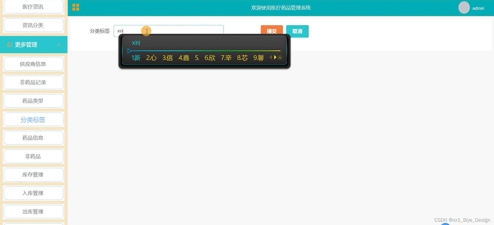 (5)更多管理:当点击“更多”这一菜单的时候,会出现供应商信息+非药品记录+药品类型+分类标签+药品信息+非药品+库存管理+出库管理+入库管理+开药记录这十个子菜单,能够对药品与非药品信息进行增删改查操作,对药品分类与分类标签进行管理,以及实现对出库入库预计库存信息进行管理等;