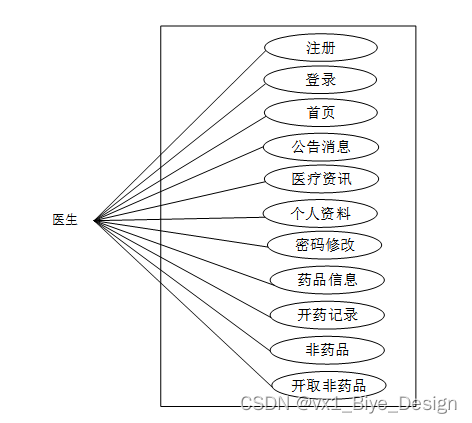 根据上一节功能分析,可以得出系统的用例,医生角色用例如图2.1所示。