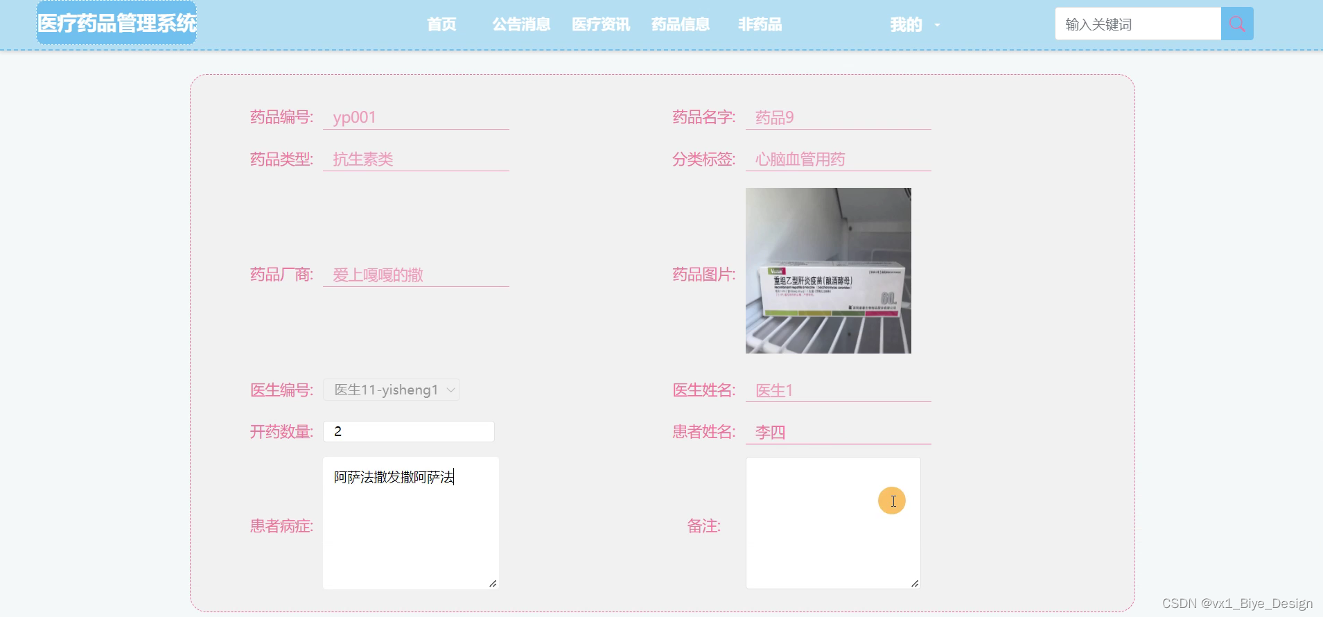 (6)开药记录:在“药品信息”下拉查看具体某个药品信息下方点击开药按钮,具体再输入开药数量、病患信息、药品数量等信息进行提交;