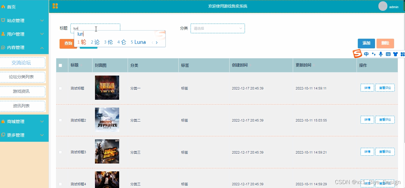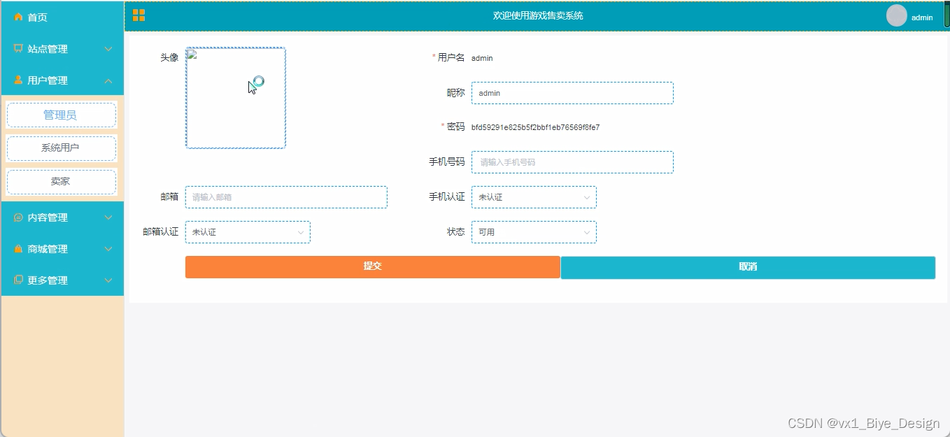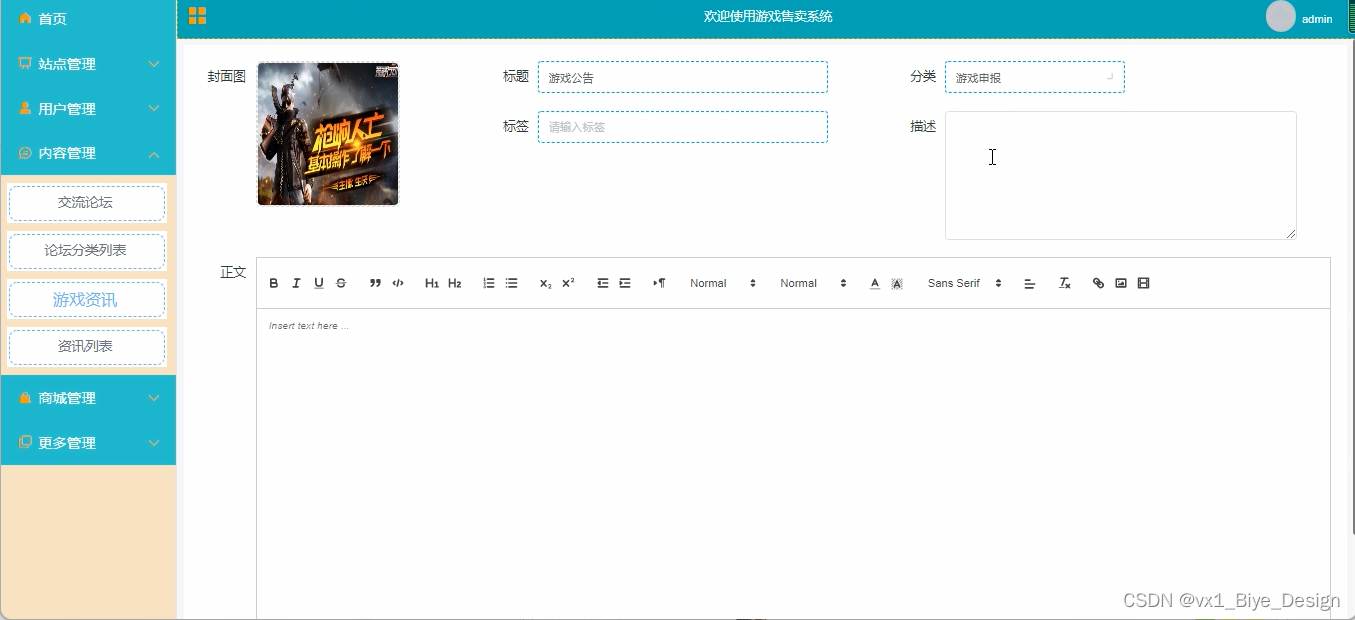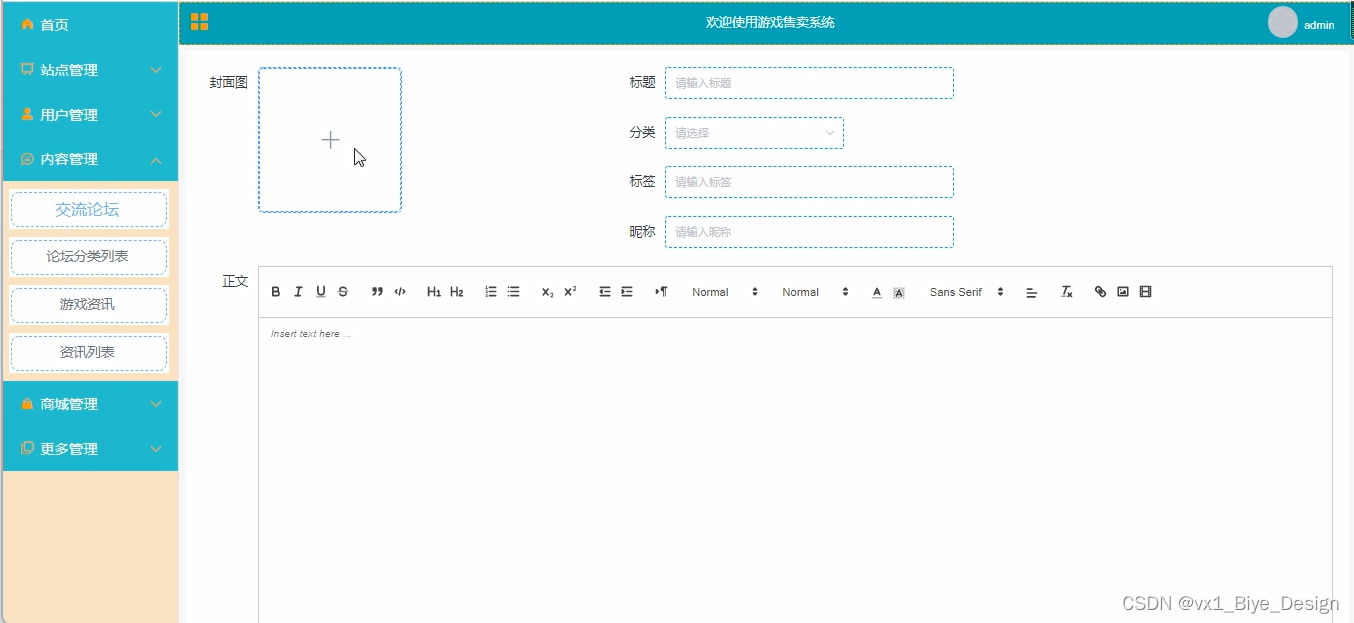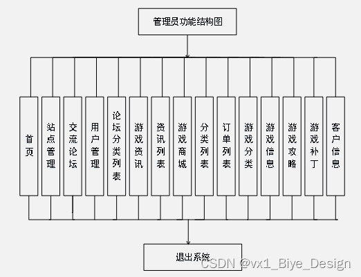 (1)功能要求:可以管理首页、站点管理(轮播图、公告栏)、用户管理(管理员、系统用户、卖家)、内容管理(交流论坛、论坛分类列表、游戏资讯、资讯列表)、商城管理(游戏商城、分类列表、订单列表)、更多管理(游戏分类、游戏信息、游戏攻略、游戏补丁、客户信息)等功能模块。