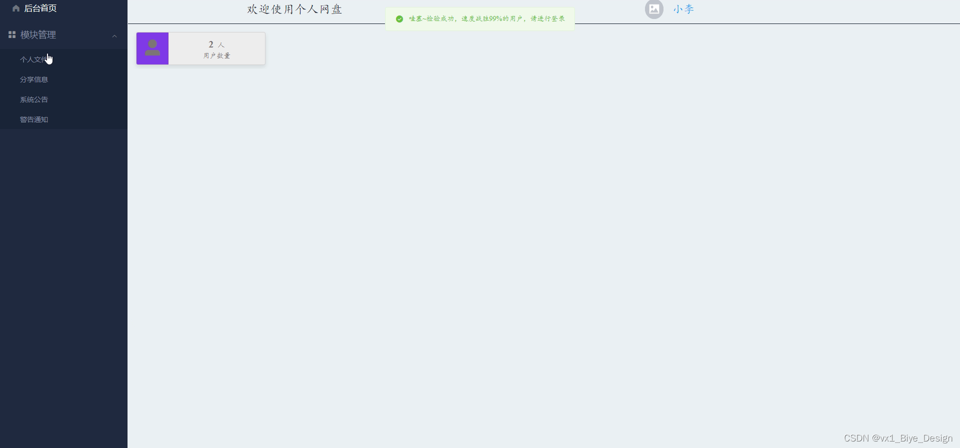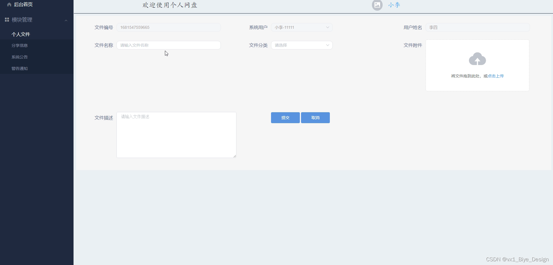 (1)功能要求:首页,文件信息、分享信息、系统公告、警告通知,修改密码,退出登录等功能模块。