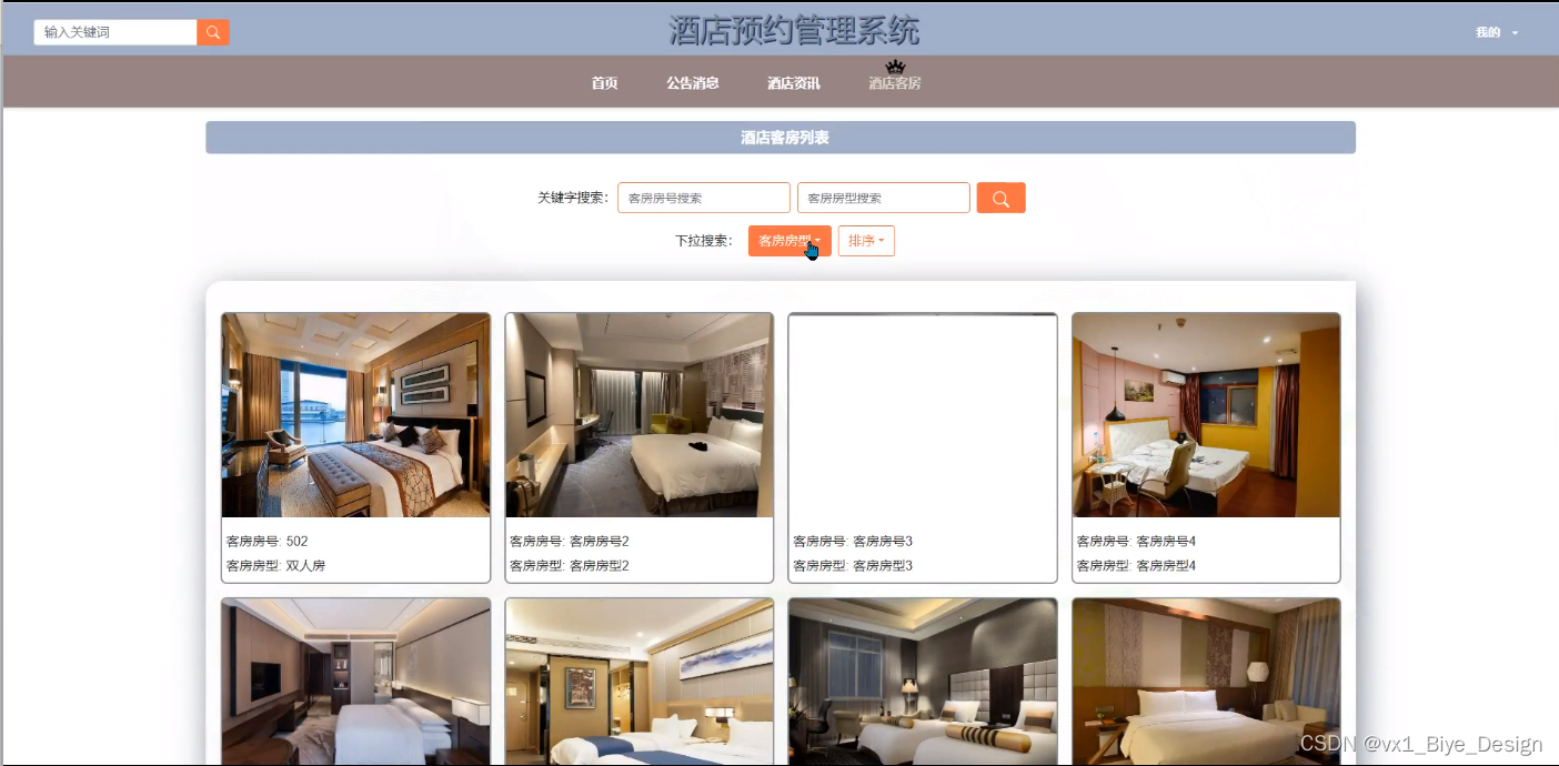 (1)功能要求:可以管理首页、个人资料(个人信息、修改密码)、公告管理(轮播图、公告消息)、用户管理(管理员、工作人员、普通用户)、信息管理(酒店资讯、资讯分类)、酒店客房、预定信息、预定取消、离店申请、线下订单、客房打分等功能模块。