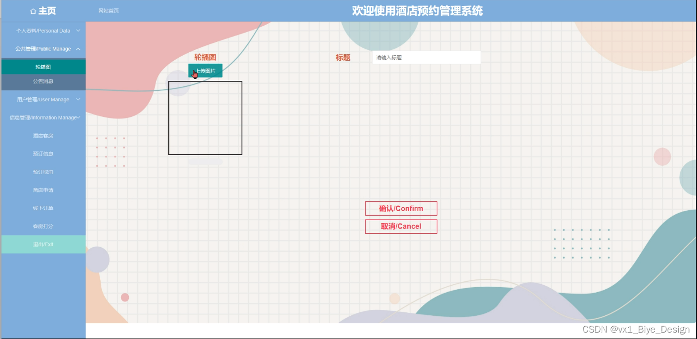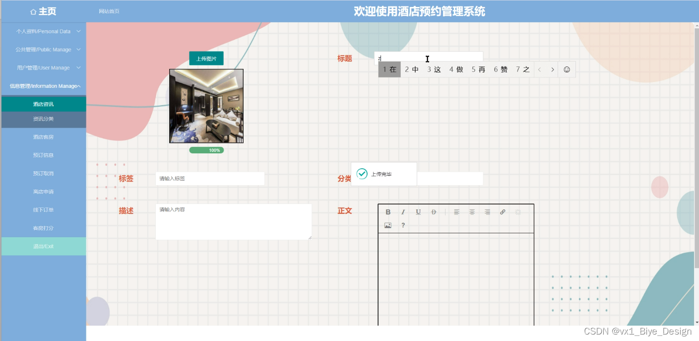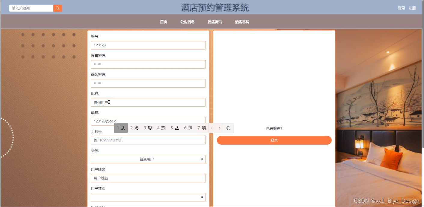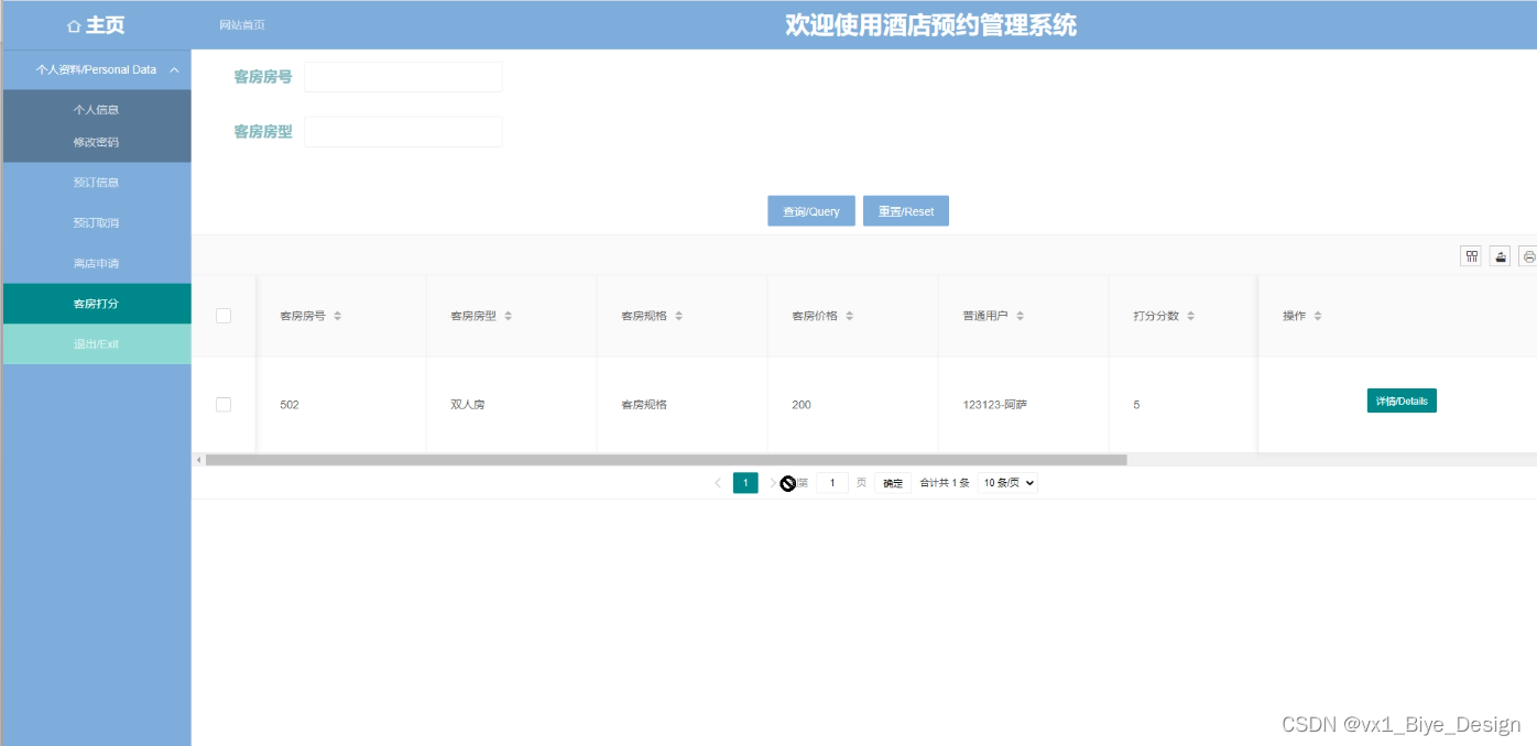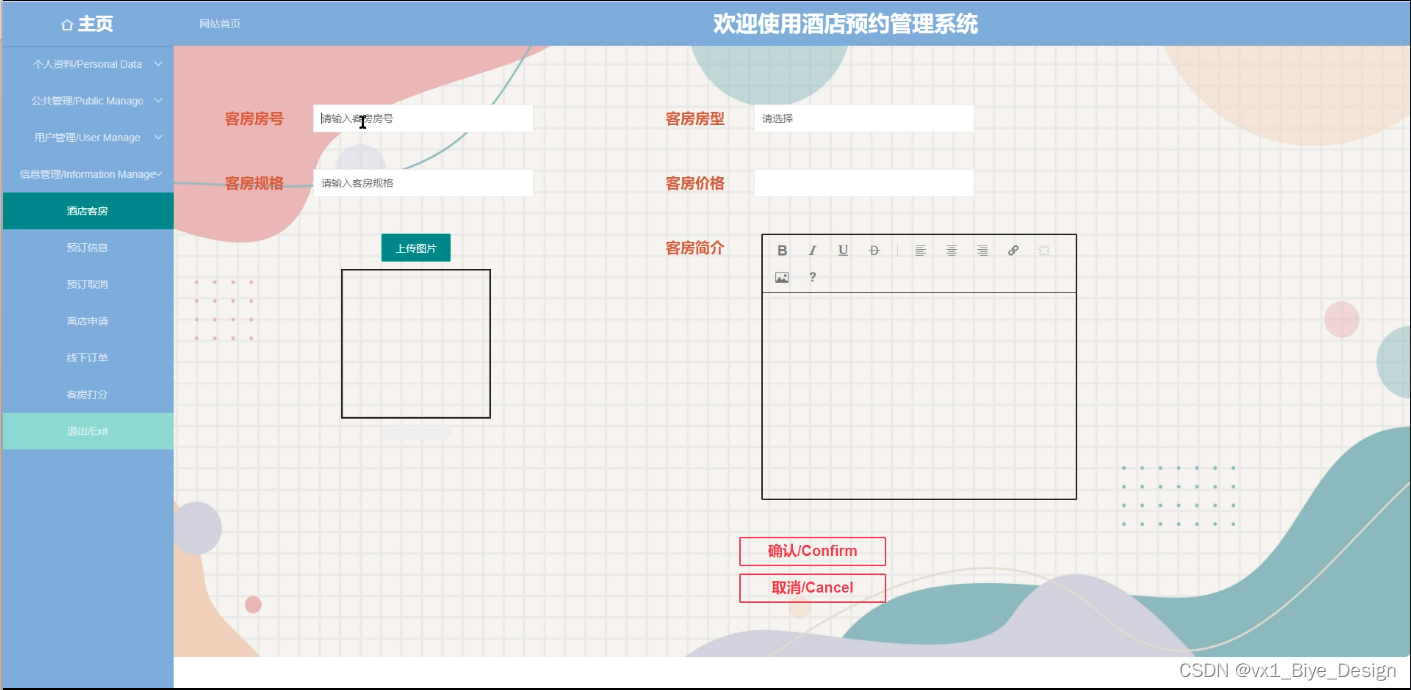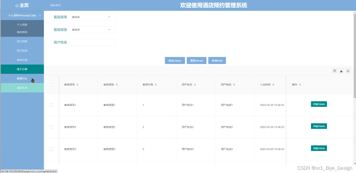 This hotel reservation management system adopts MySQL as the main storage unit for backend data, and uses the Thinkphp framework and Redis technology for business system coding and development, achieving all functions of this system. During the design process, the system code was fully guaranteed to have good readability, practicality, scalability, universality, ease of later maintenance, easy operation, and concise pages.