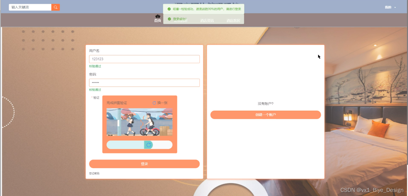 用户登录,用户通过填写用户名、密码、权限、验证码等信息,输入完成后选择登录即可进入酒店预约管理系统,如图5-8所示。