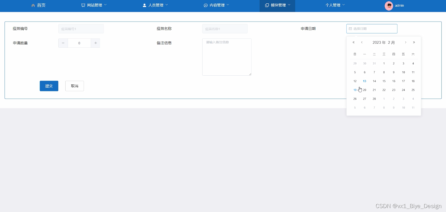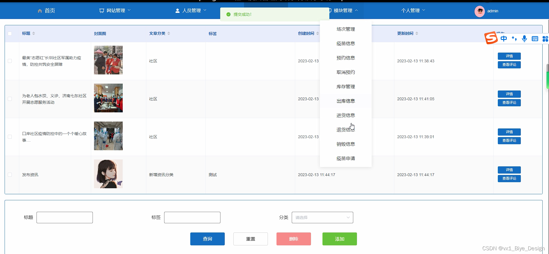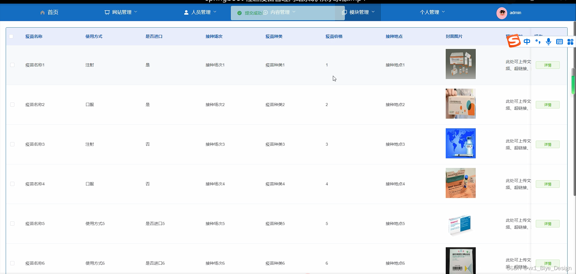 3、功能的完善性:可以管理首页、网站管理(轮播图、公告信息)人员管理(管理员、仓库管理者、普通用户)内容管理(社区资讯、资讯分类)模块管理(场次管理、疫苗信息、预约信息、取消预约、库存管理、出库信息、进货信息、退货信息、销毁信息、疫苗申请)个人管理模块的修改和维护操作。