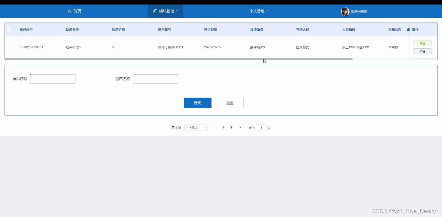接种预约管理,在接种预约管理页面可以查看接种序号、疫苗名称、疫苗价格、用户账号、预约日期、接种场次、预约人群、人员信息等信息,如图5-12所示。