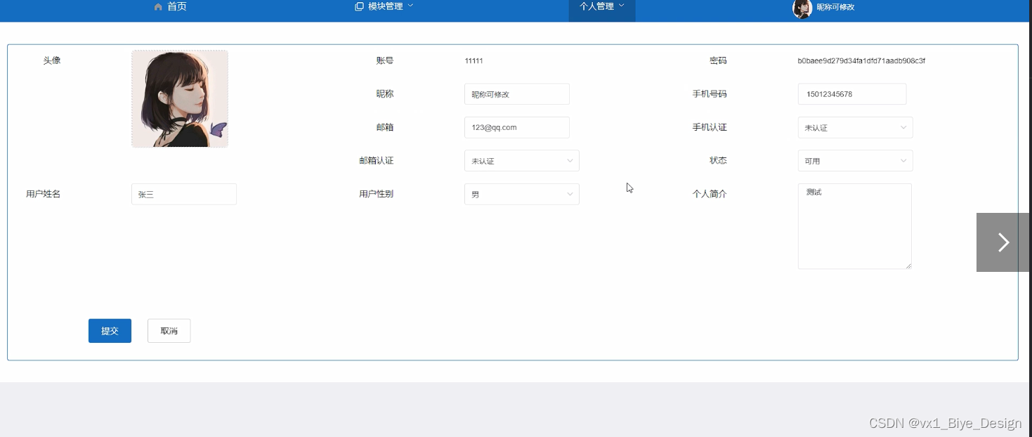 个人中心,在个人中心页面通过填写用户账号、用户姓名、性别、年龄、联系电话、电子邮箱、身份证号、个人照片等信息进行修改,如图5-10所示。