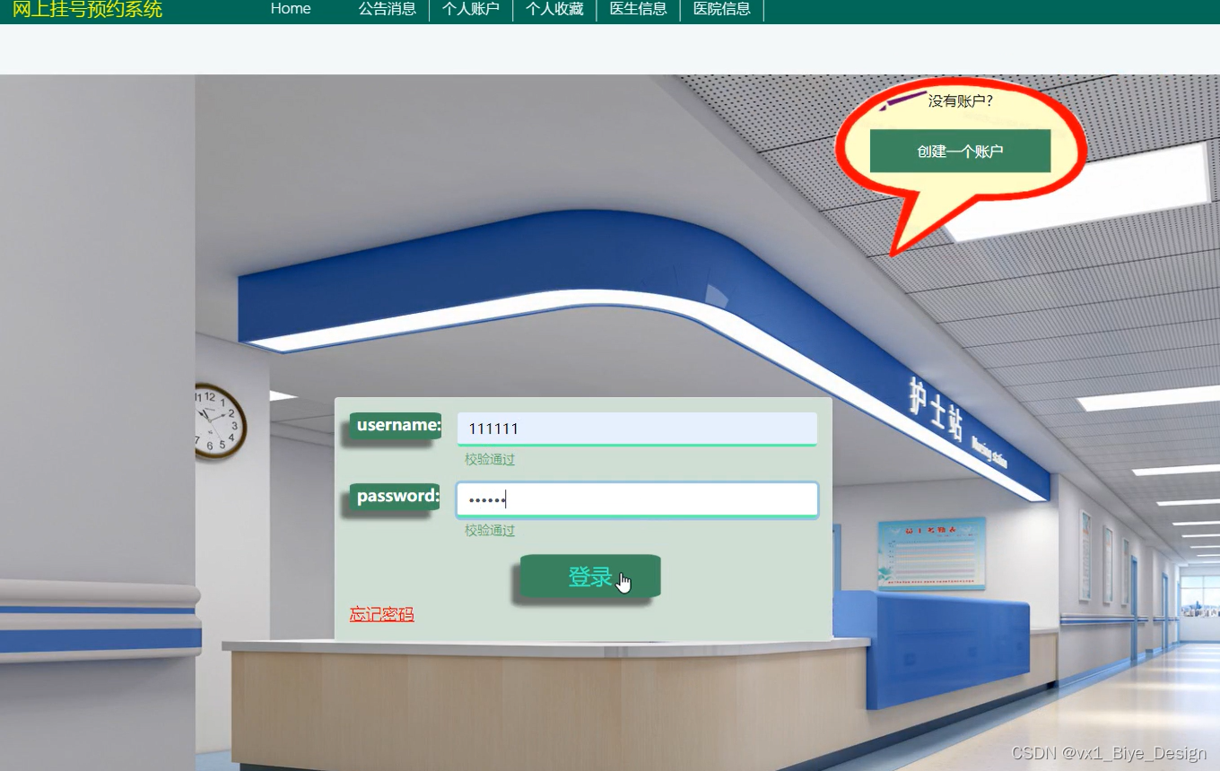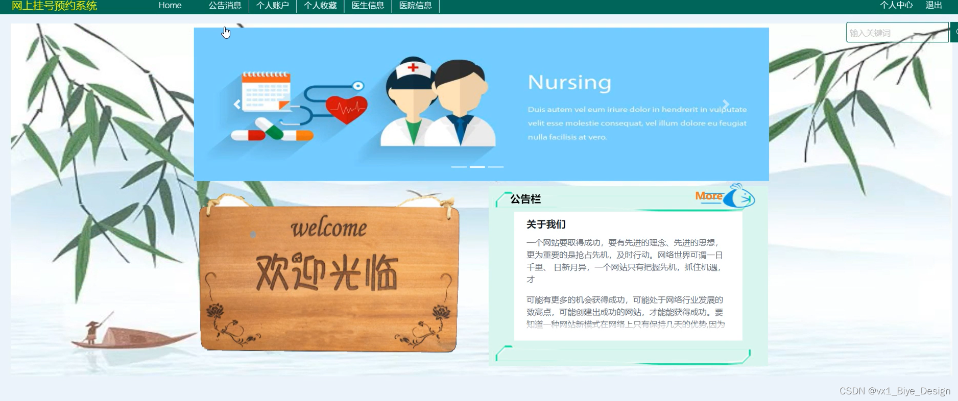 登录后进入收首页,可以查看到Home、公告消息、个人账户、个人收藏、医生信息、医院信息、个人中心等功能。首页界面如下图所示。