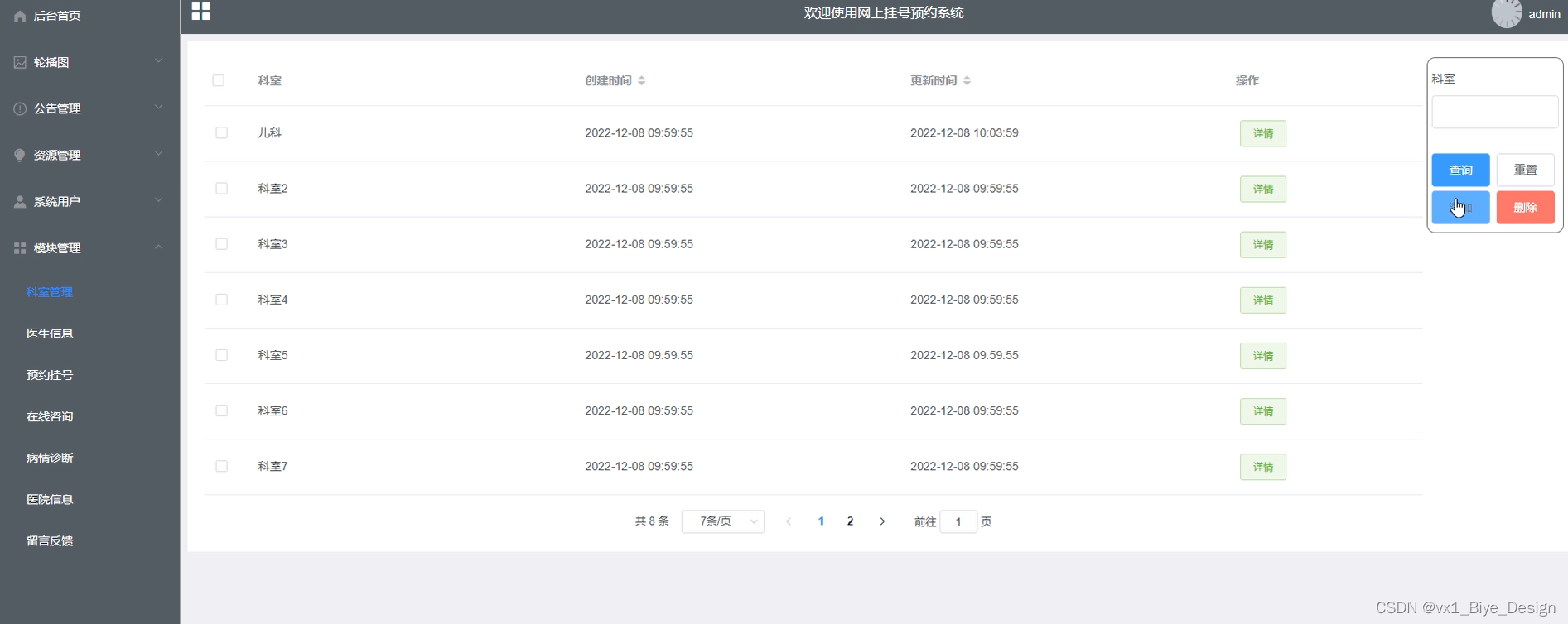 科室管理可以查看科室、创建时间、更新时间等信息,进行查询、重置、添加、删除、查看评论等操作。