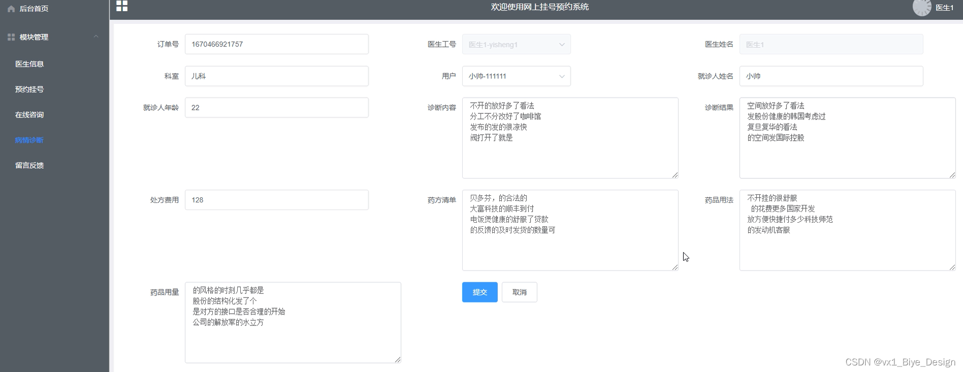病情诊断可以查看订单号、医生姓名、科室、就诊人姓名等信息,进行查询、重置、添加、删除、支付、留言反馈等操作。