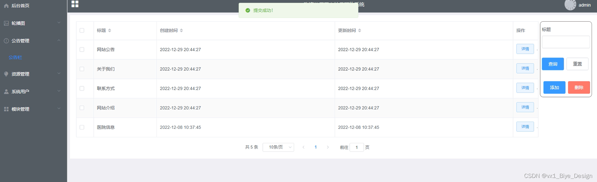 管理员对公告信息进行管理,在此页面可以查看标题、创建时间等信息,进行查询、重置、添加、删除等操作。