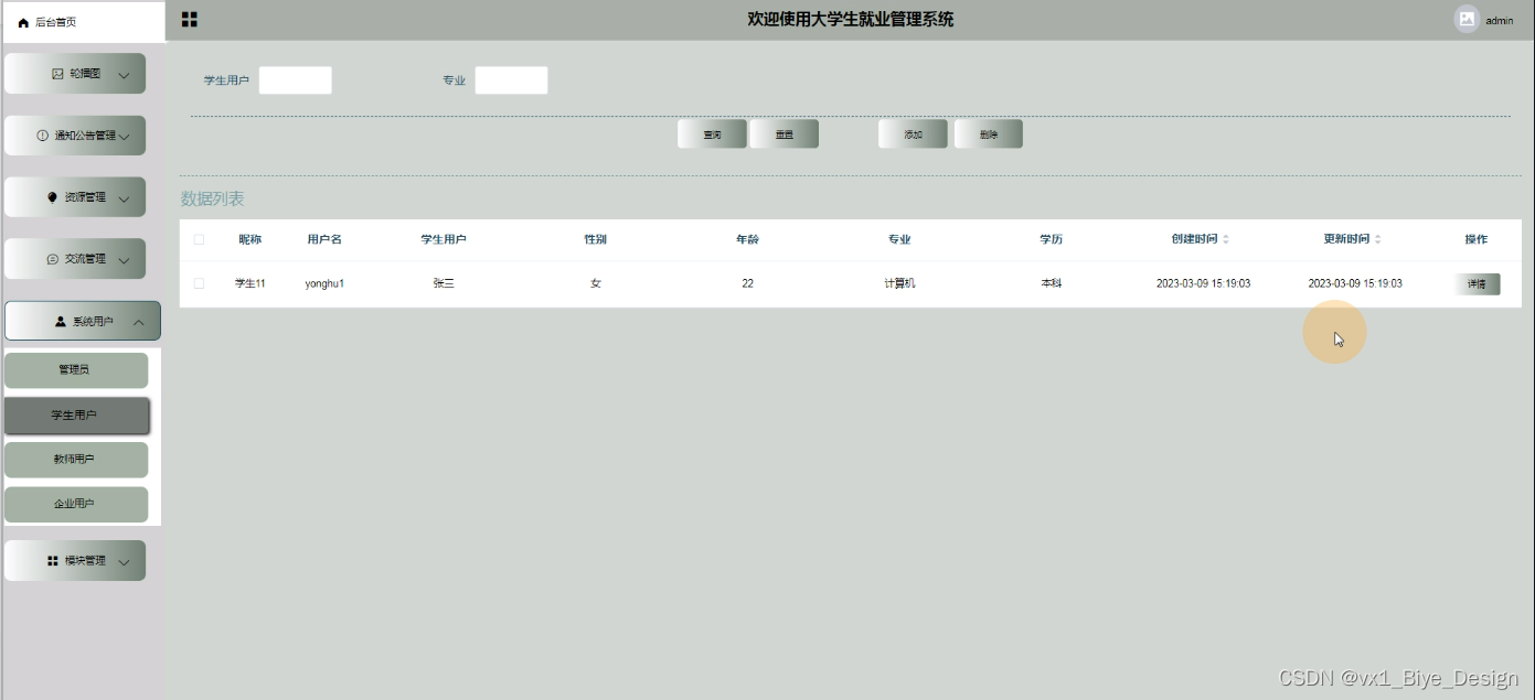 [18]李朋飞,杨威,张润东,王赫,尚双圆,董振杰.高校就业管理系统的设计与实现[J].电子测试,2019(01):93-94+118.DOI:10.16520/j.cnki.1000-8519.2019.01.038.