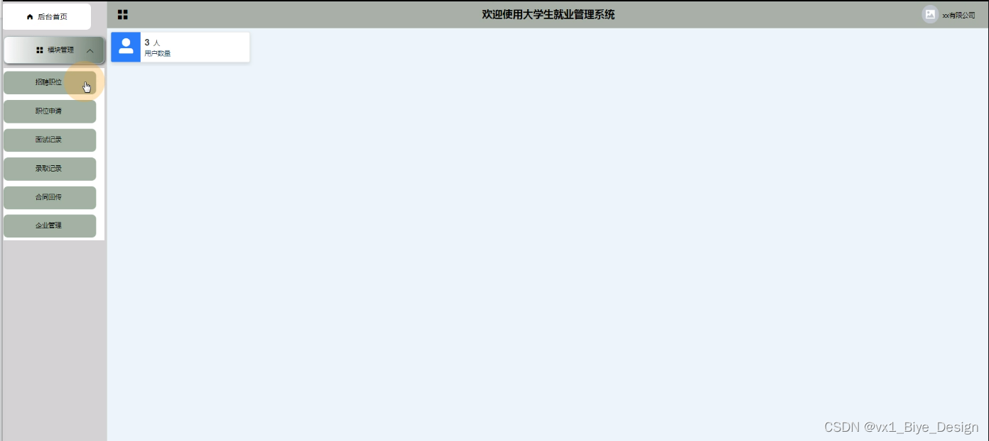 企业登录进入大学生就业管理系统可以查看首页、模块管理(招聘职位、职位申请、面试记录、录取记录、合同回传、企业管理)等内容。如图5-14所示。