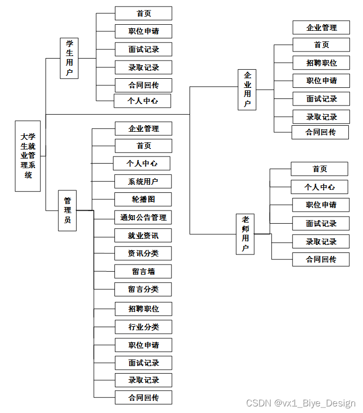 大学生就业管理系统总体分为前学生模块、企业模块、教师模块和管理员模块。