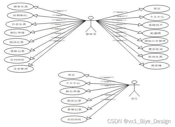 大学生就业管理系统的功能主要分为前台用户根据自己的需求进行注册登录,浏览职位信息并对选中的职位进行申请操作。后台系统管理员因职责的不同,分为普通管理员和超级管理员,普通管理员主要对申请单进行处理,而超级管理员主要对注册用户,就业资讯、资讯分类列表、就业信息进行处理。