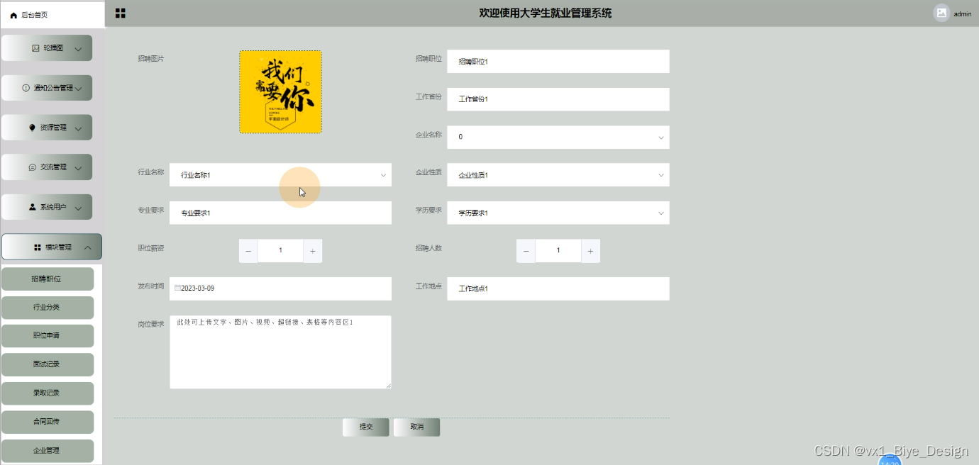 实用性方面,本次设计的主要任务是在大学生就业管理系统内首页、轮播图(轮播图管理)、通知公告管理(通知公告)、资源管理(就业资讯、资讯分类)、交流管理(留言墙、留言分类)、系统用户(管理员、学生用户、教师用户、企业用户)、模块管理(招聘职位、行业分类、职位申请、面试记录、录取记录、合同回传、企业管理)等,符合当前潮流的发展。从用户角度出发,同时也考虑系统运营成本和人力资源,采用网络上的便捷方式,实现线上业务,使得业务流程更系统,也更方便用户的体验,比较实用。