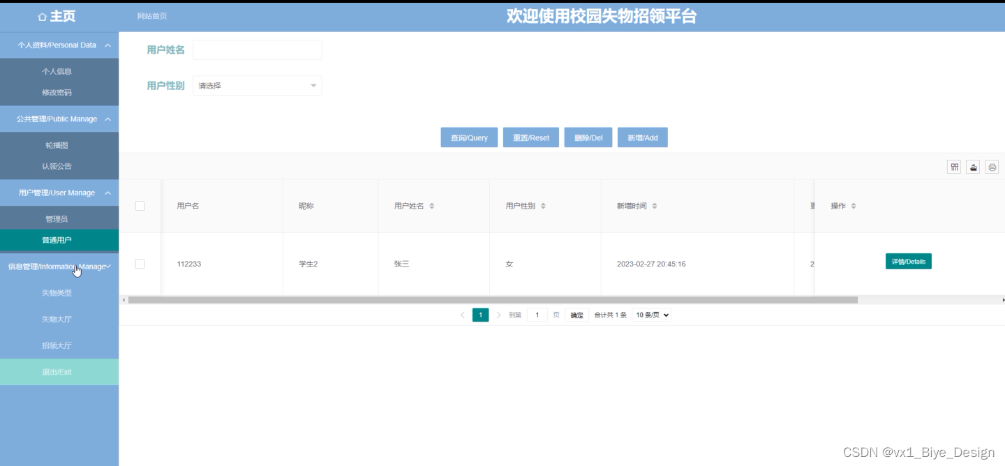 SSM校园失物招领平台的主要使用者分为管理员和用户,实现功能包括:首页、用户管理(管理员、普通用户)、公共管理(轮播图、认领公告)信息管理(表扬榜单、榜单分类)失物类型、失物大厅、招领大厅、个人资料(个人信息、修改密码);用户:首页、认领公告、表扬榜单、失物大厅、招领大厅、个人资料(个人信息、修改密码)等功能。由于本网站的功能模块设计比较全面,所以使得整个校园失物招领平台的过程得以实现。