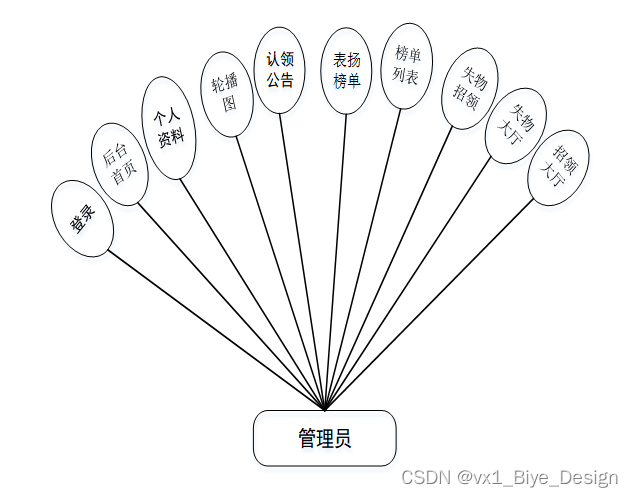 (1)管理员模块:系统中的核心用户是系统管理员,管理员登录后,通过管理员菜单来管理后台系统。主要功能有:首页、用户管理(管理员、普通用户)、公共管理(轮播图、认领公告)信息管理(表扬榜单、榜单分类)失物类型、失物大厅、招领大厅、个人资料(个人信息、修改密码)等功能。管理员用例图如图3-1所示。
