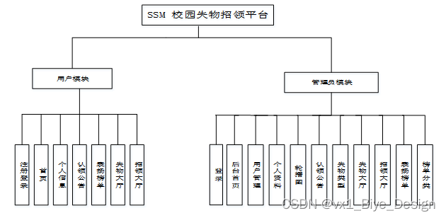 本校园失物招领平台主要包括两大功能模块,即管理员功能模块和用户模块。
