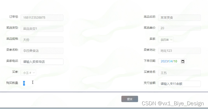 买家选择需要的菜品了解菜品详情,选择相应的菜品下单,在菜品信息添加页提交下单表单,填写下单信息,生成下单记录。