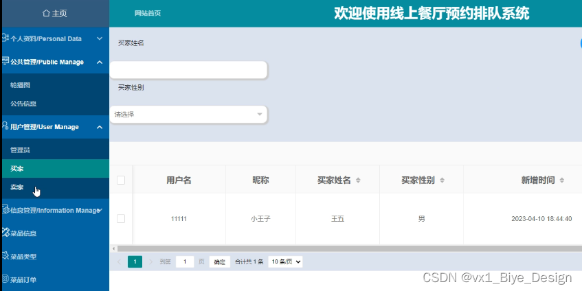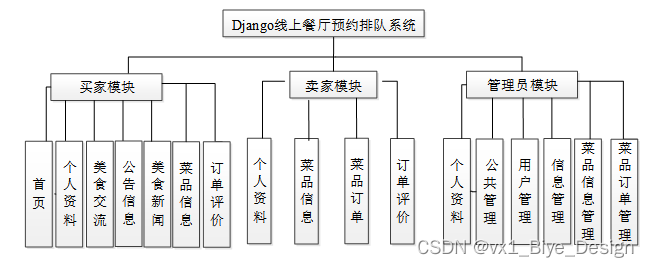 根据用户对系统的需求,要求系统简单操作,能够准确,完整的对信息进行管理。线上餐厅预约排队系统在对需求做解析后,整个系统主要分为两个部分:管理员和买家,卖家,每个模块下的分支功能不一样。对功能做出如下说明: