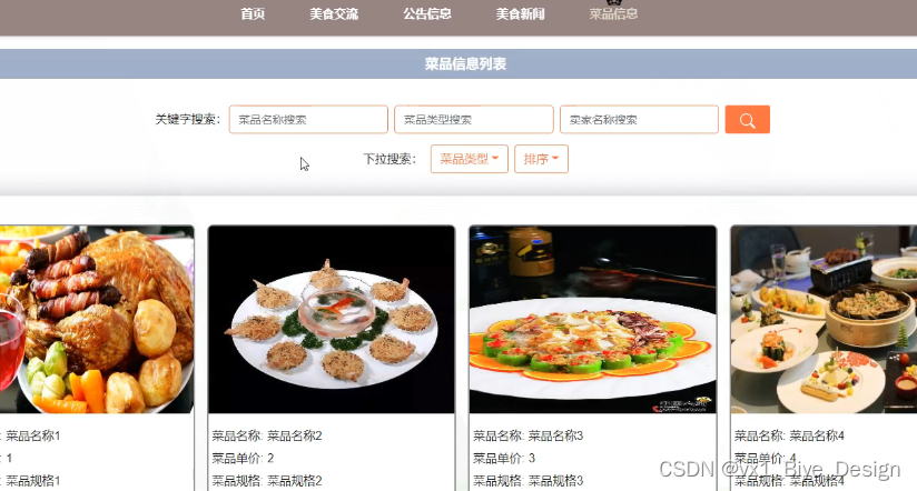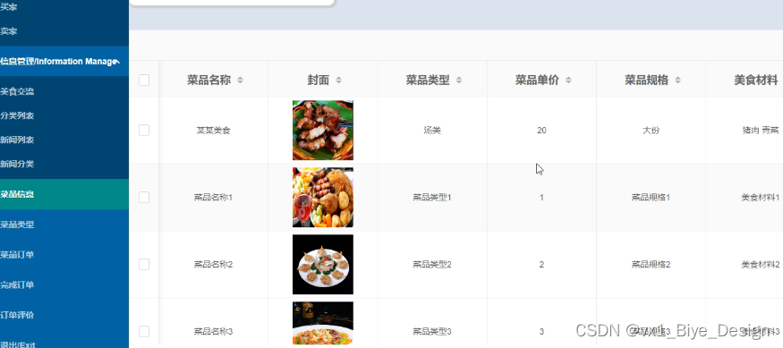 管理员或卖家在菜品信息列表查询,添加,修改,删除菜品信息,跳转至菜品信息查询,添加,修改,删除表单,提交菜品信息,包括菜品名称、菜品类型、单价,规格,美食材料等,菜品信息提交后,数据库的菜品信息表刷新数据,系统将菜品信息展示出来。