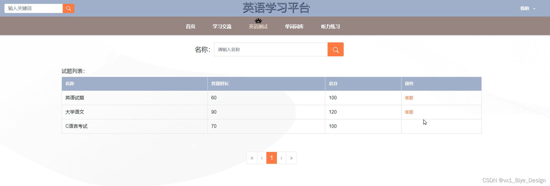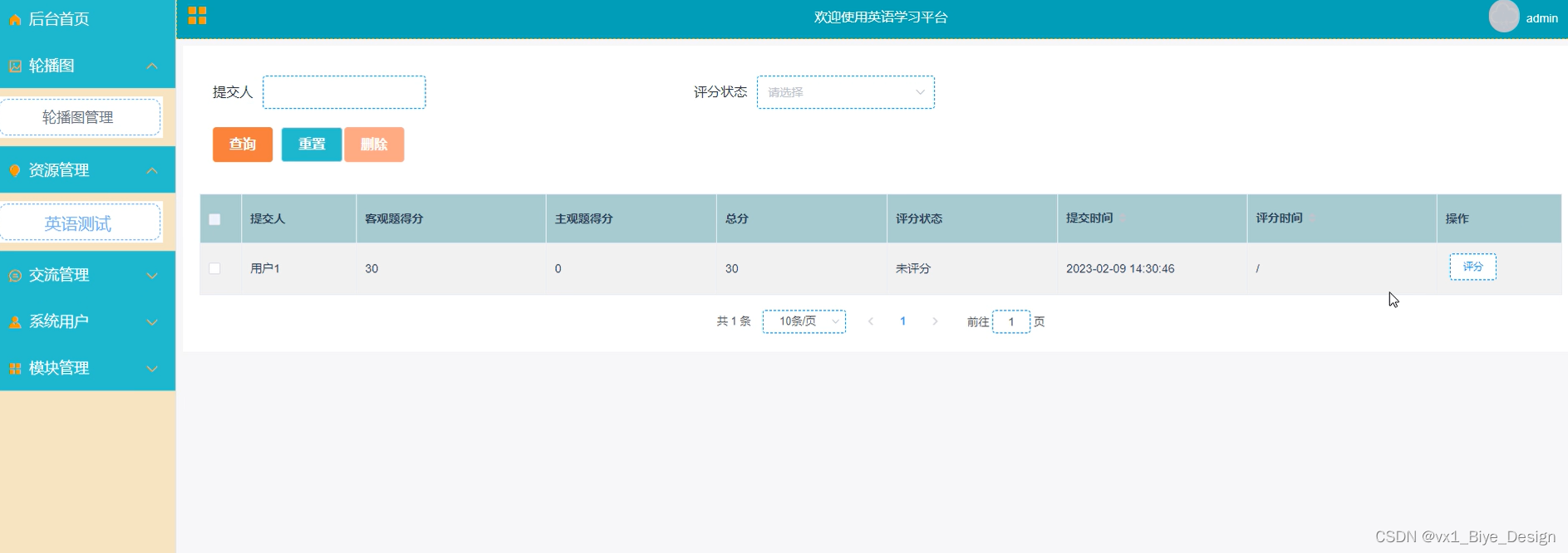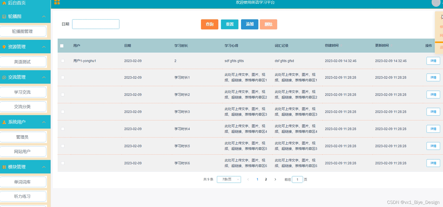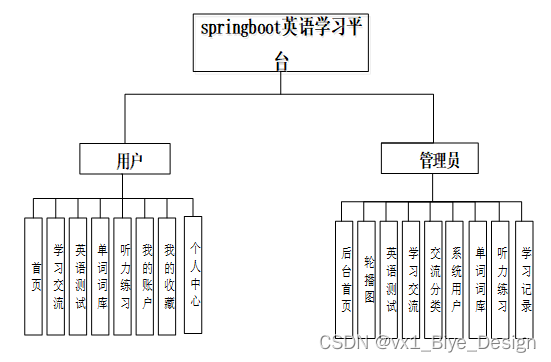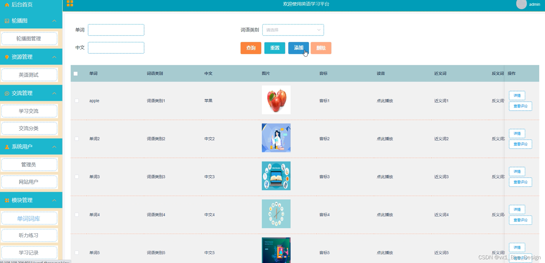 (1)功能要求:可以管理首页、轮播图、英语测试、交流管理(学习交流、交流分类)、系统用户(管理员、网站用户)、模块管理(单词词库、听力练习、学习记录)等功能模块。