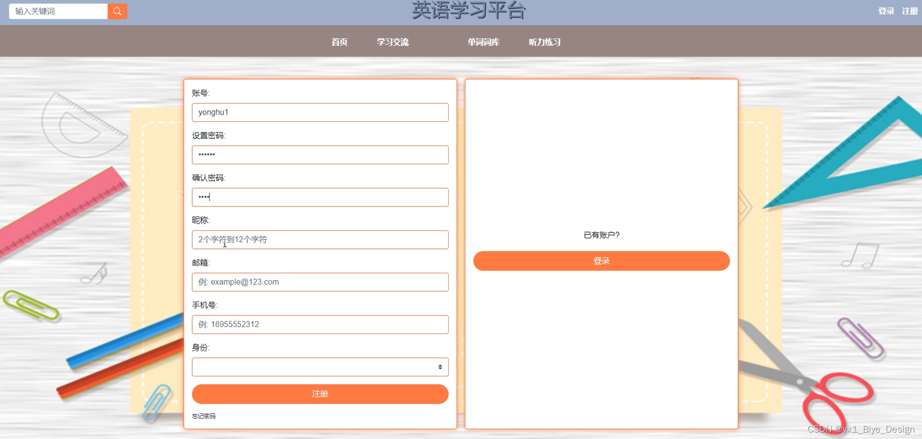 用户注册,在用户注册页面填写账号、密码、昵称、邮箱、手机号、身份等信息进行用户注册,如图5-3所示。