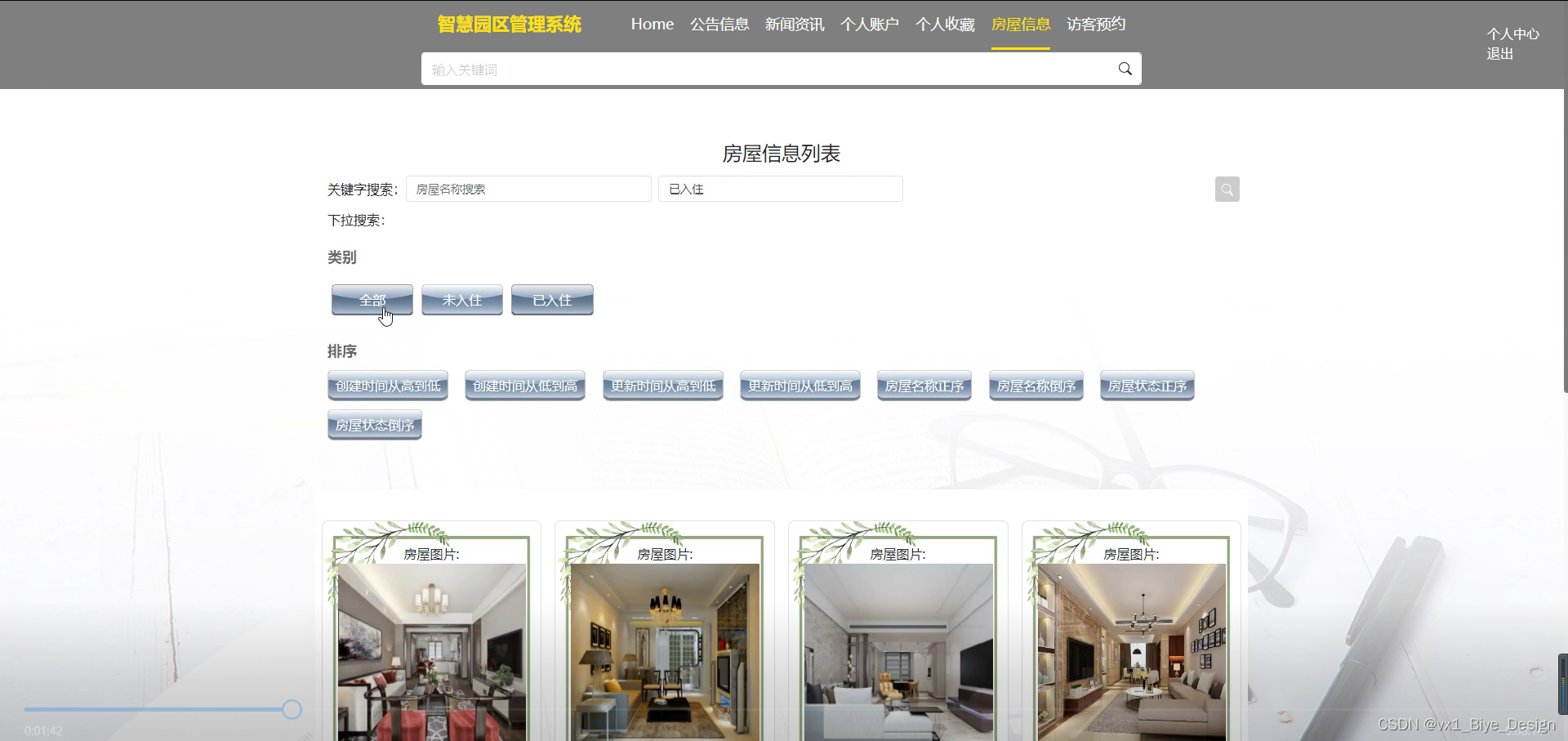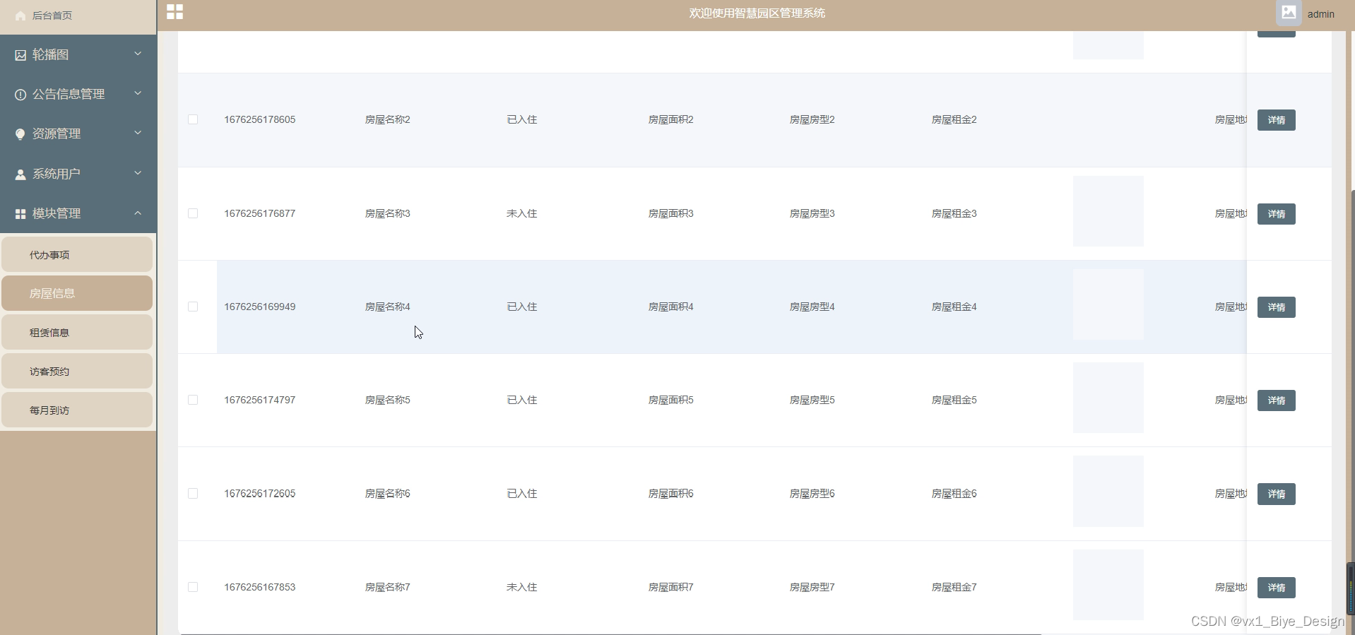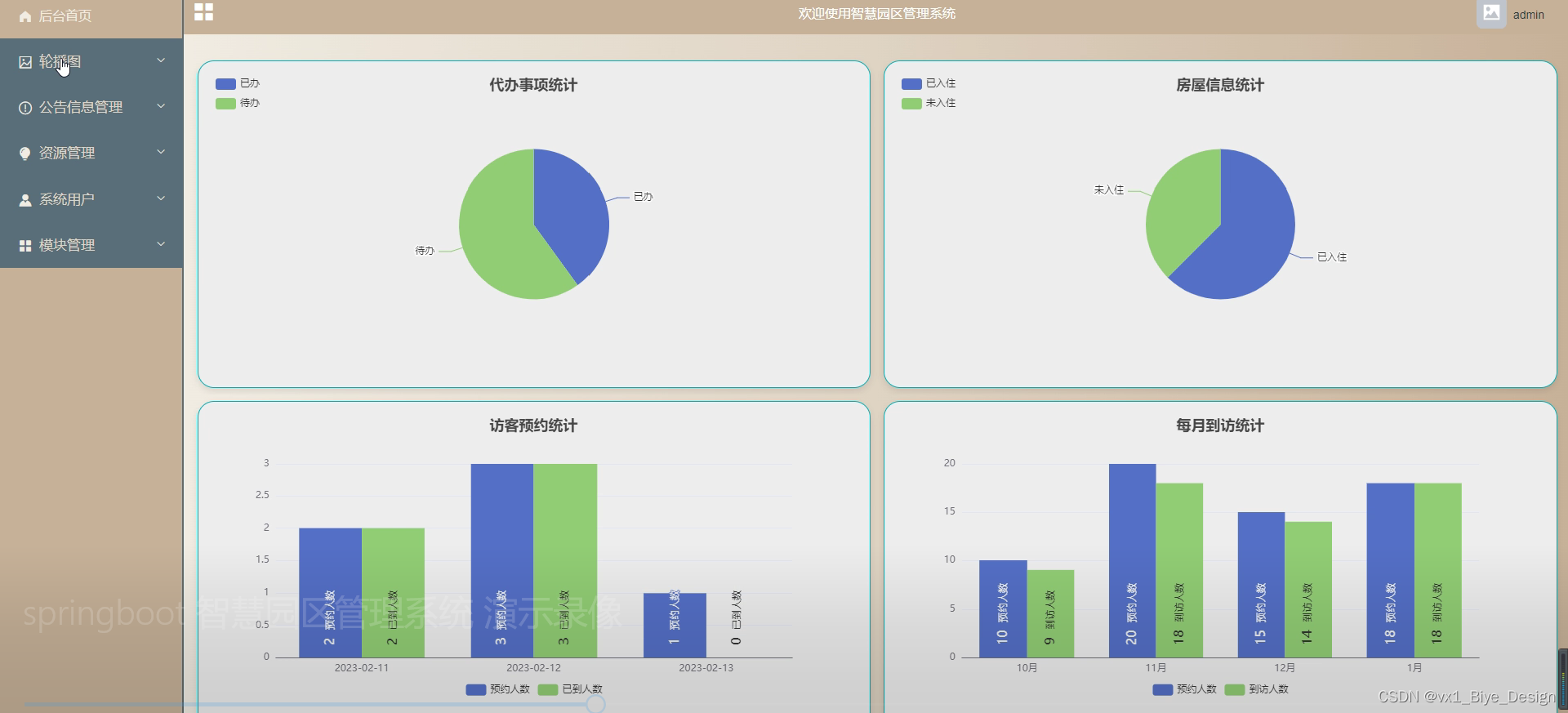 管理员登录进入智慧园区管理系统可以查看首页、公告管理、用户管理(管理员、普通用户)资源管理(新闻资讯、资讯分类)模块管理(房屋信息管理、代办事项管理、租赁信息管理、访客预约管理、每月到访管理)等信息,如图4-6所示。